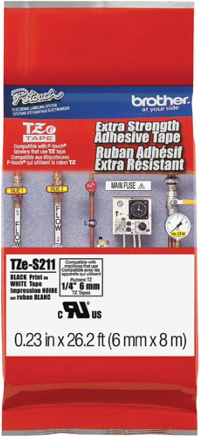 Brother Genuine P-touch TZE-S211 Tape, 1/4" (0.23") Wide Extra-Strength Adhesive Laminated Tape, Black on White, Laminated for Indoor or Outdoor Use, Water-Resistant,0.23" x 26.2' (6mm x 8M), TZE-S211