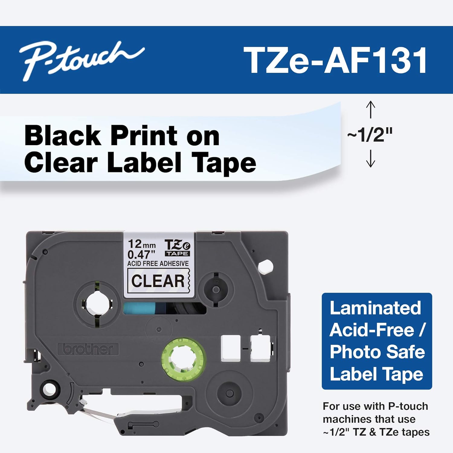 Brother Genuine P-touch TZE-MQG35 Tape, 1/2" (0.47") Wide Standard Laminated Tape, Black on Clear, Laminated for Indoor or Outdoor Use, Water-Resistant, 0.47" x 26.2' (12mm x 5M), TZeAF131