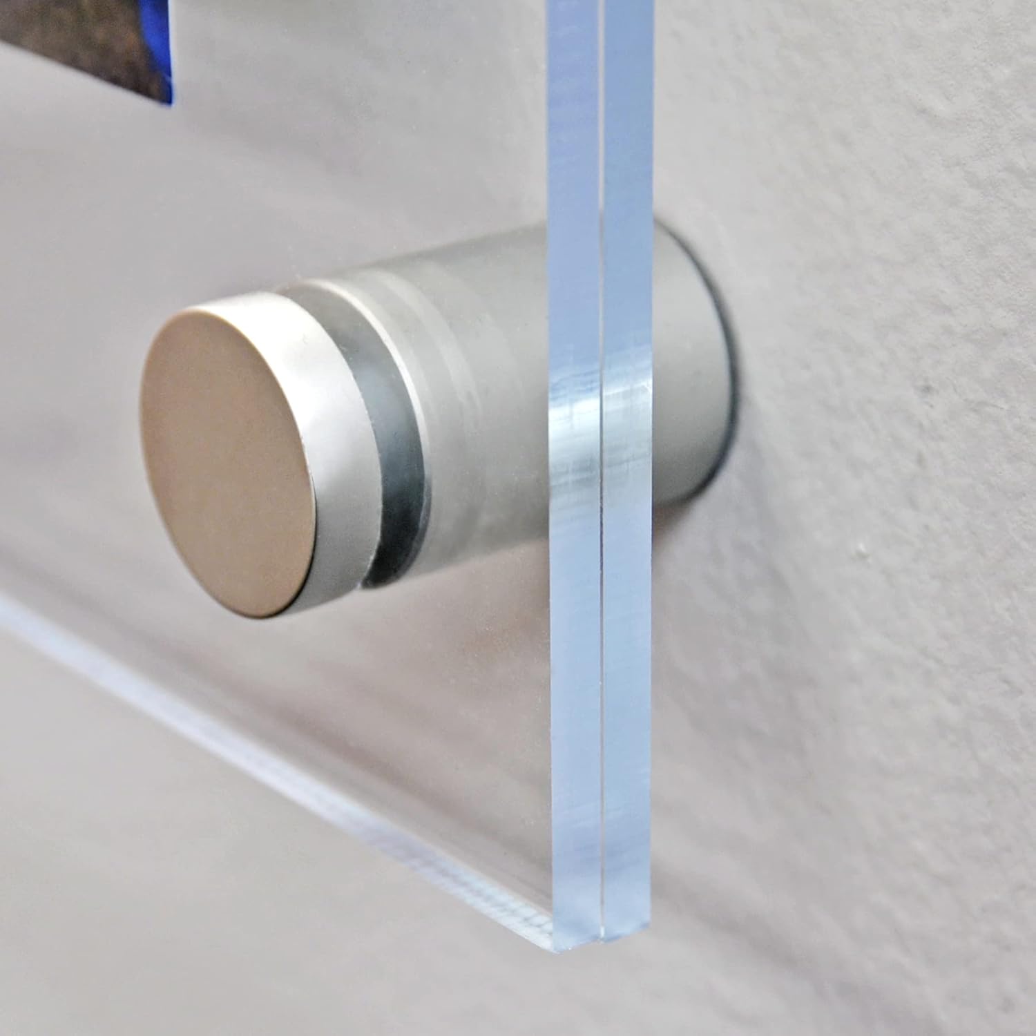 - β Floating Acrylic Wall Frame with Silver Stand Off Caps:11" x 17" Graphic Size. Overall Frame Size: 15" x 21"