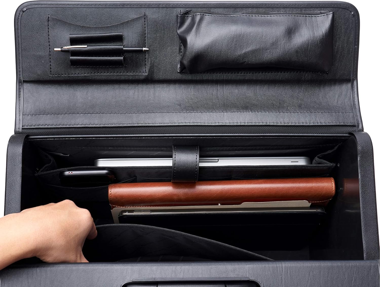 - Features : Our laptop carrying case flap-over section comes with organizer that includes a card slot, two pen slots, and a small zipper pocket that measures 8β x 3β x 1.5β. Closure has secure dual combination locks can be individually set. Laptop cases front pocket expands 2 inches and has a button latch. Side pockets each measure 6β x 1 3/8β x 9β. Spacious enough for A4 and legal sized documents.