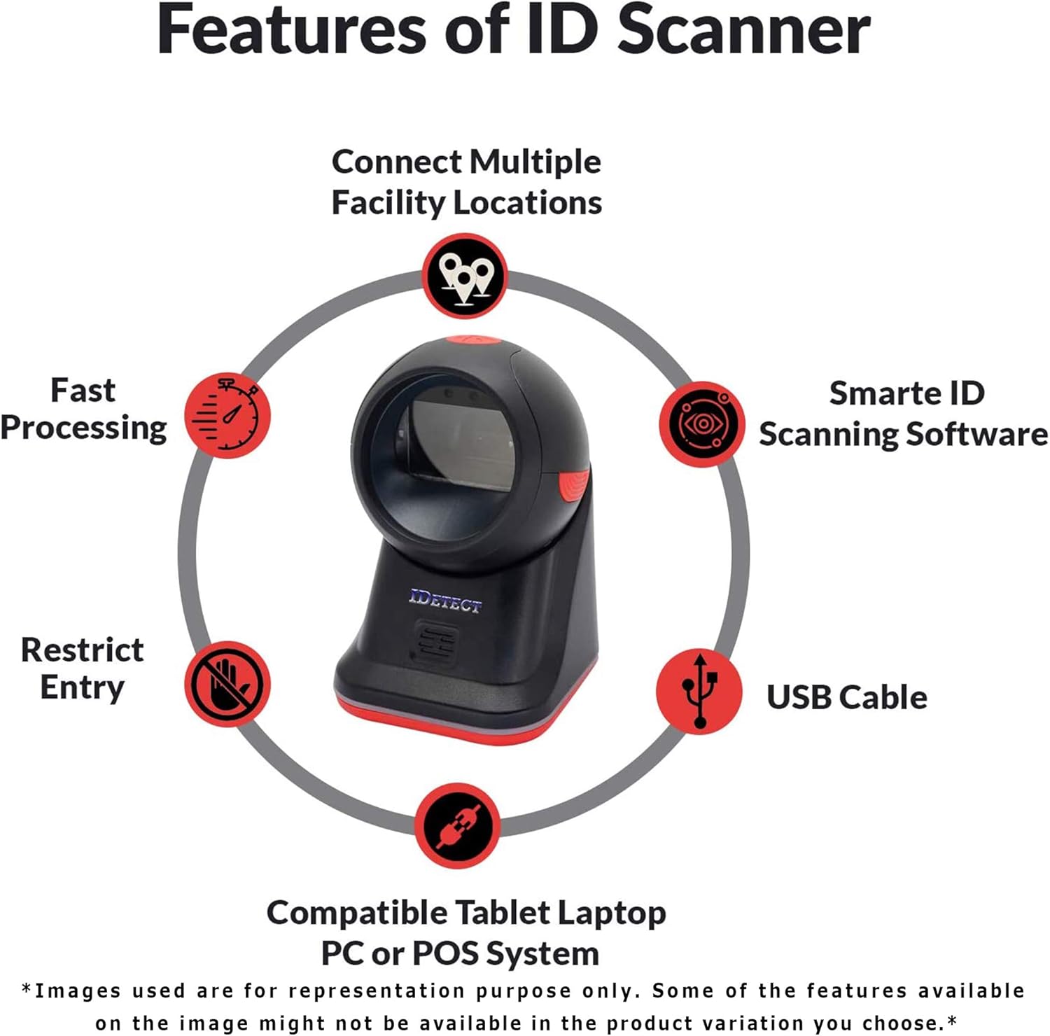 - PROTECT YOUR BUSINESS: When an ID card is scanned, the IDetect screen pops up on the POS (or PC) screen notifying immediately if the identification card is tampered with, banned, on a watch list or shared with another patron. This USB barcode scanner optionally takes and stores the picture of the patron, then automatically returns back to the screen before the scan is done. (It does not stop all fake IDs but does provide 100% diligence proof.)