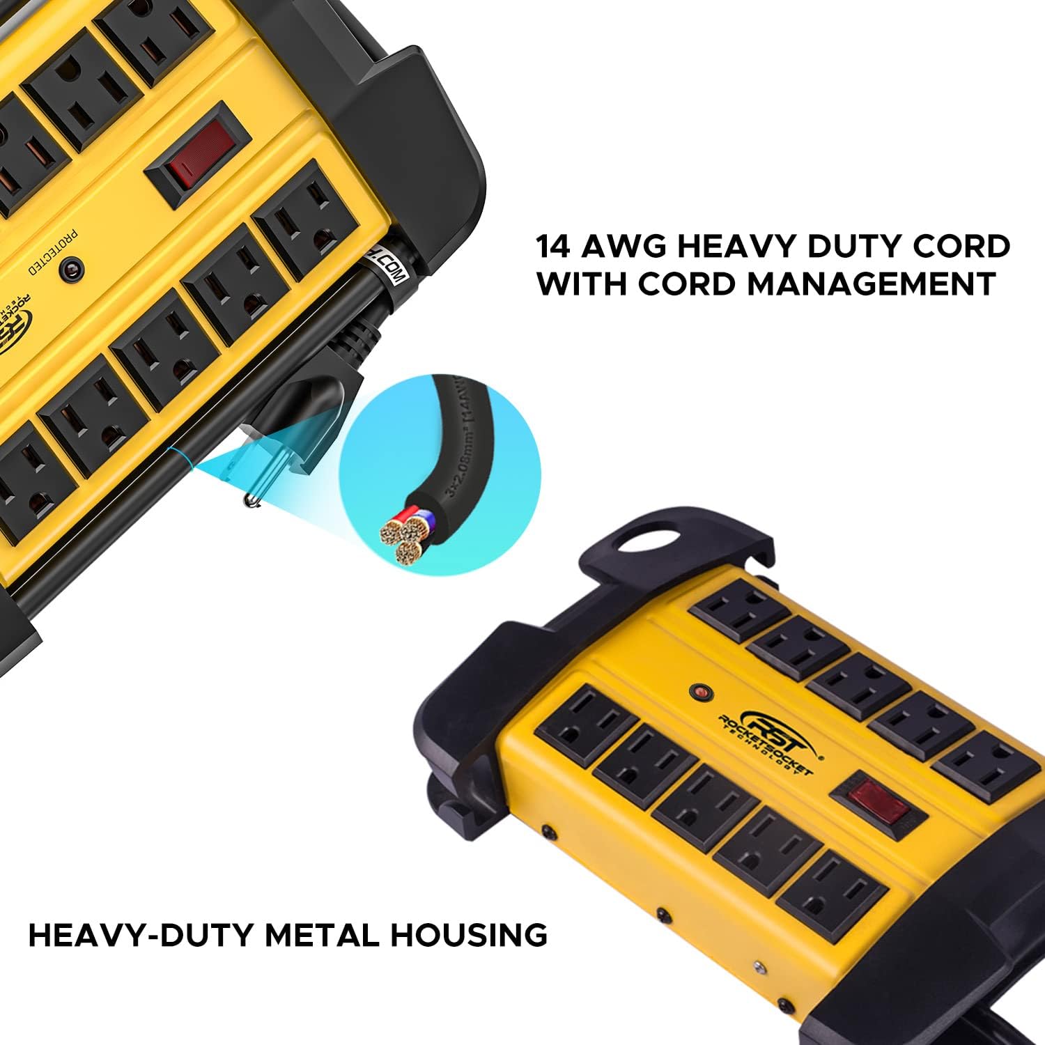 CRST 10-Outlets Heavy Duty Power Strip Metal Surge Protector with 15 Amps, 15-Foot Power Cord 2800 Joules for Garden, Kitchen, Office, School, ETL Listed(3165047) (10-Outlet, Yellow)