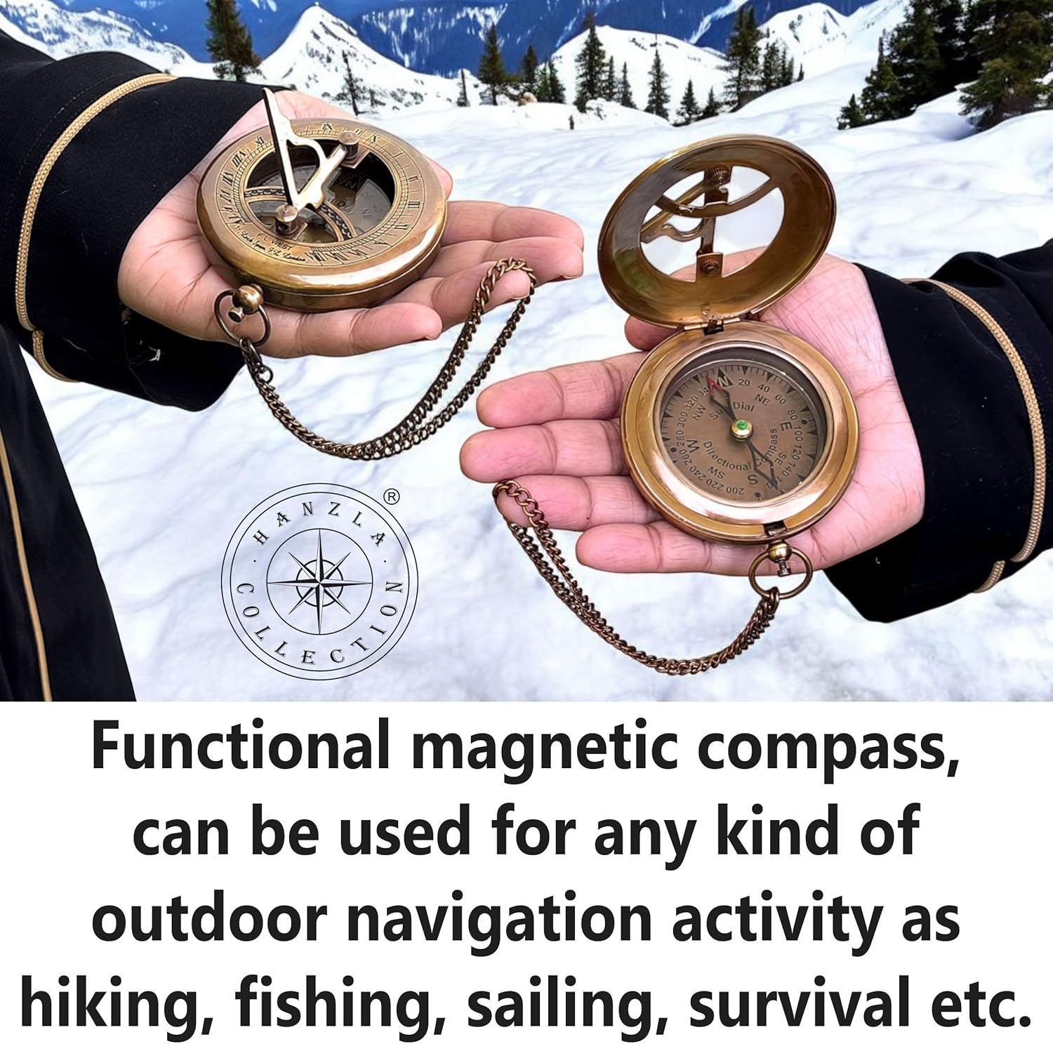 - This sundial compass is beautifully crafted from high-quality brass material with push open mechanism. The dimensions of Brass Sundial are : 3 x 3 x 1 inches; & the weight with leather case is 0.250 kg (0.551 Pounds), & comes with 12 inches long brass chain in a handmade leather case. Size of Case : 3.25 x 1.5 x 3.5 Inches Approx.