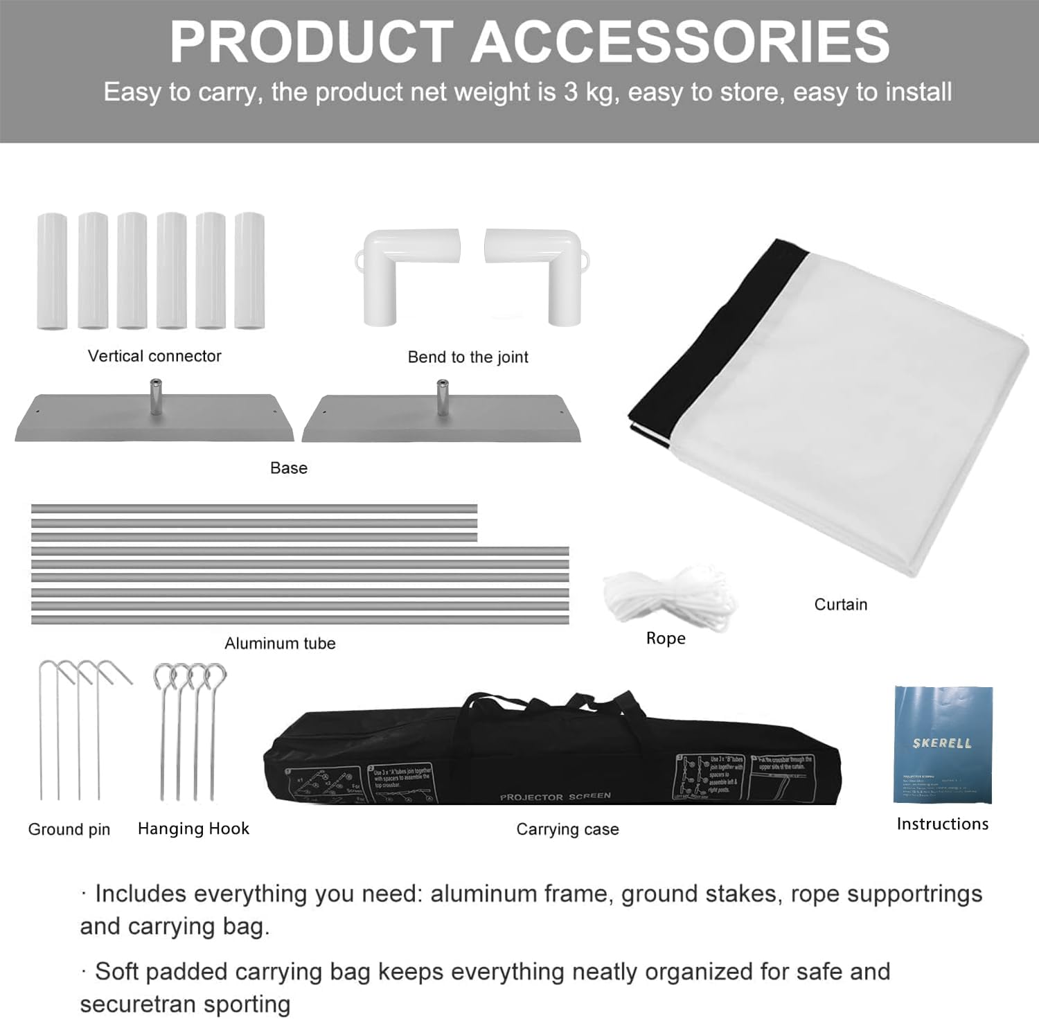 - 【Easy to Install】You can easily complete the installation within 5 minutes without any tools according to the instructions of the screen for projector.If you encounter windy weather, you need to use the ropes, nails, and water bags we provide to secure it. You can perfectly enjoy your outdoor movie time
