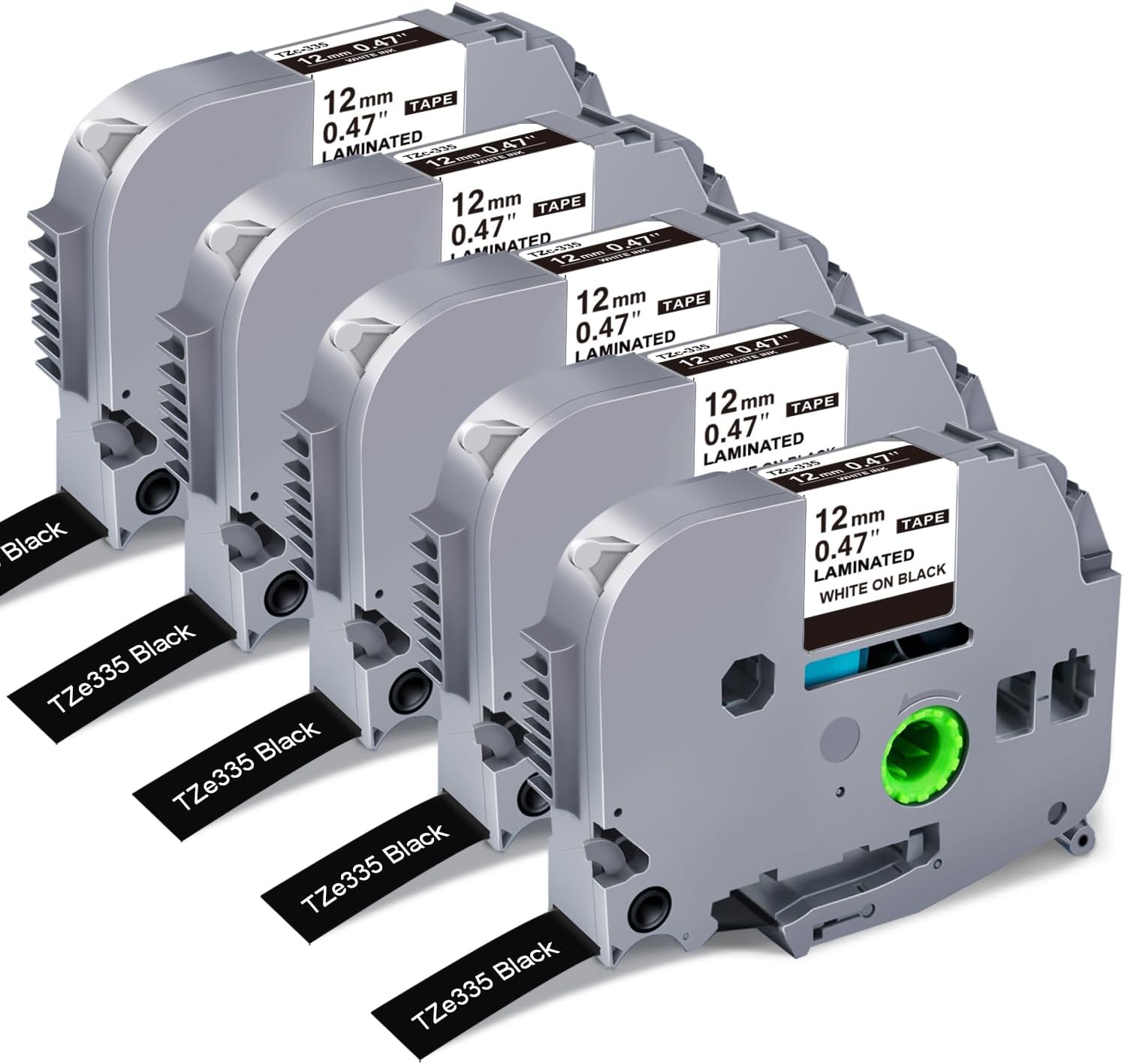 - Package Includes: 5 Pack Compatible with Brother p touch TZe-335 white on black label tape; Size: 12mm (0.47 in) x 8m (26.2 ft), Color: White on black labels