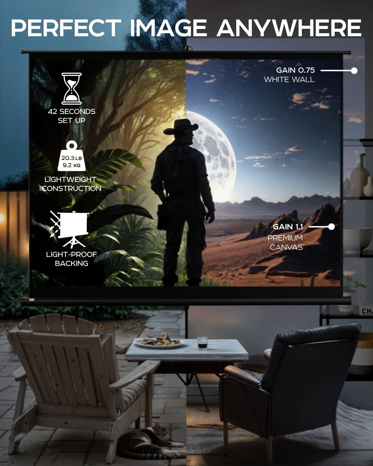 - Indoor Outdoor projection movie screen is secured by convenient tight-straps, it could be carried to backyard or auditorium in a perfectly fitted projector screen bag, its retractable and adjustable design can be easily assembled in 3 steps