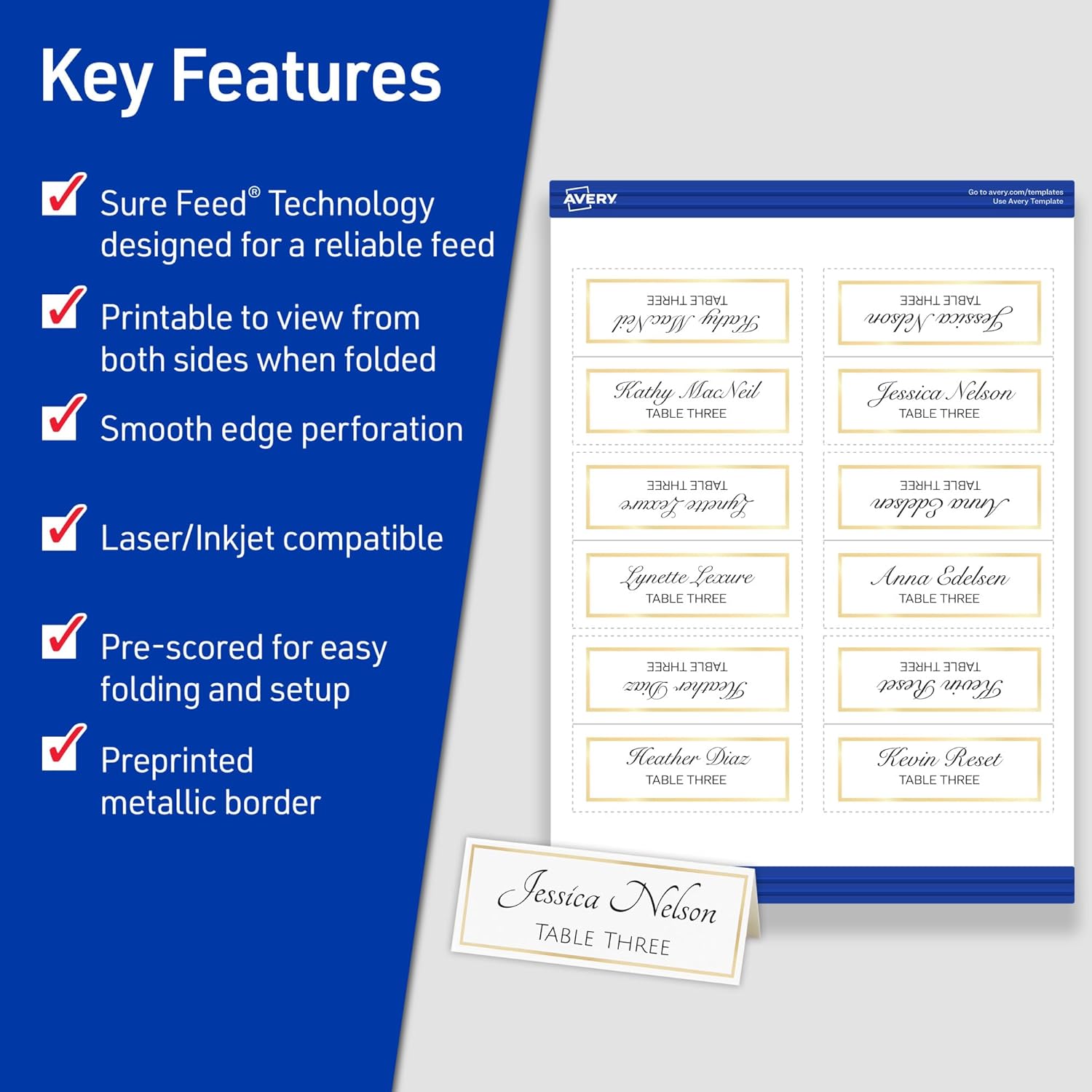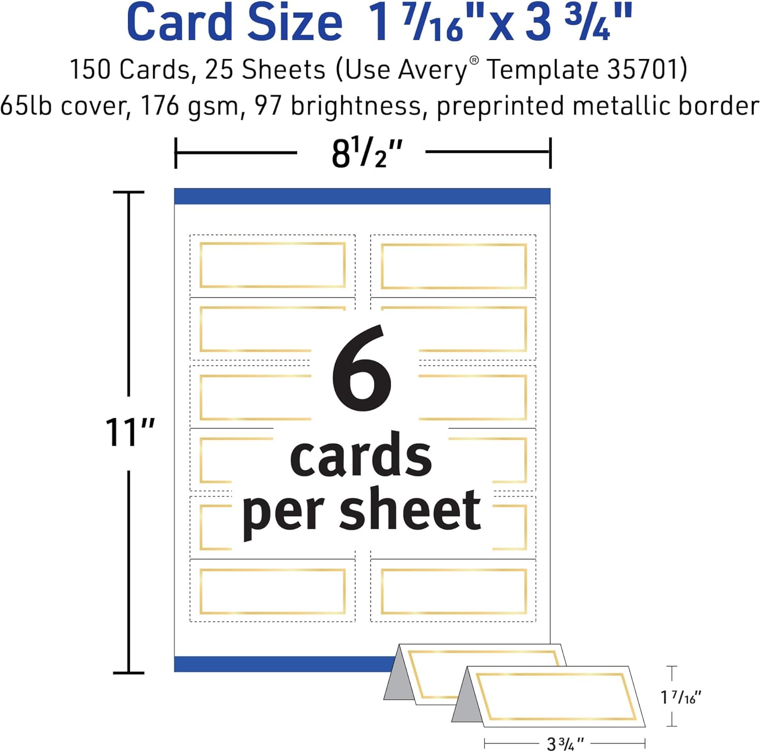 Avery Printable Place Cards with Sure Feed Technology, 1-7/16" x 3-3/4", White with Gold Border, 150 Blank Tent Cards for Laser or Inkjet Printers (35701)