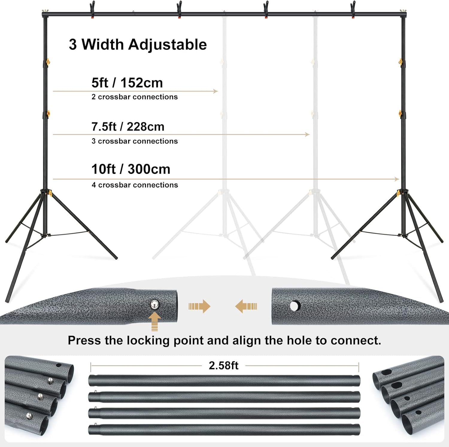 - Crossbar of back drop adjustable stand with 4 section to control width, 1 for 2.5ft, 2 fot 5ft, 3 for 7.5ft, and 4 for 10ft