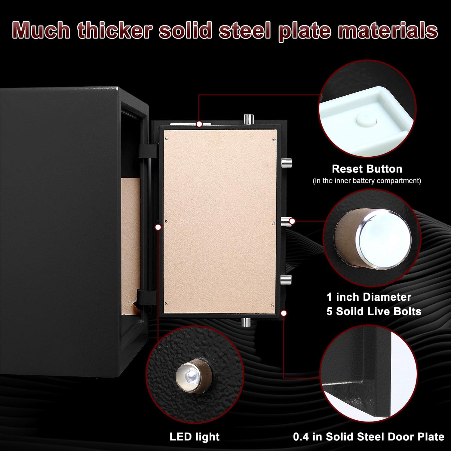 - ✅【STURDY&SAFE】: The safe box is Made of solid steel construction, the thickness of the door plate is up to 10MM, this Tigerking safe box has equipped with five 25MM solid live-locking bolts, Pry-resistant concealed hinges reinforces the door for added security.