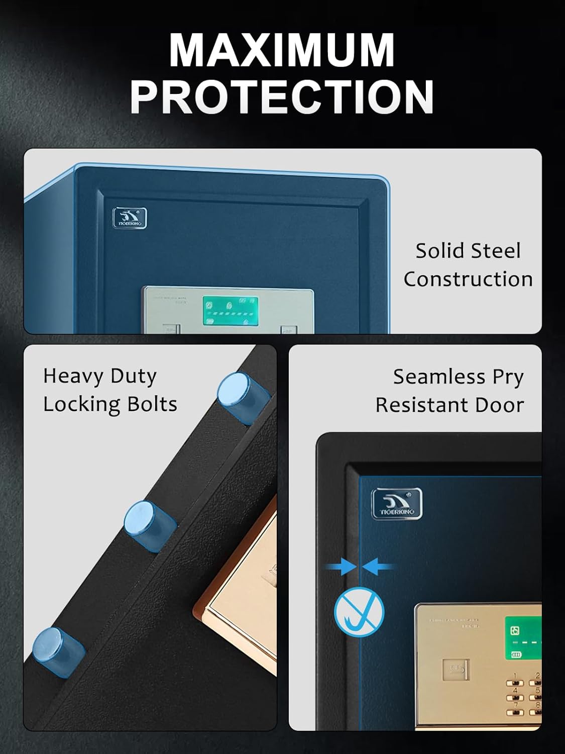 - [Safe and sturdy]: The safe is made of solid steel construction, with 1-inch front door plate, equipped with three 1 inch solid live-locking bolts; weight 52.9 pounds; Password plus key setting make sure locking all dangers out of the safe box;