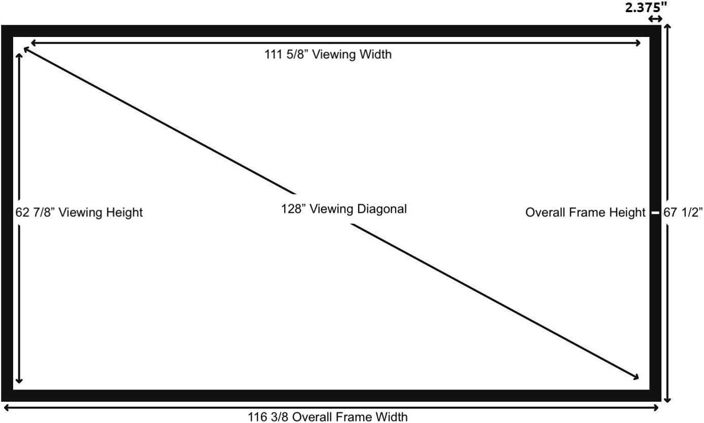 - Wall Mounted Fixed Frame Projection Screen (Overall Size 67.5" Tall x 116.375" Wide) (Viewing Area 128" Diagonal x 62.875" Tall x 111.625" Wide) No option for Legs or Stands with this product. Recommended for projectors with Native 16:9 Resolution