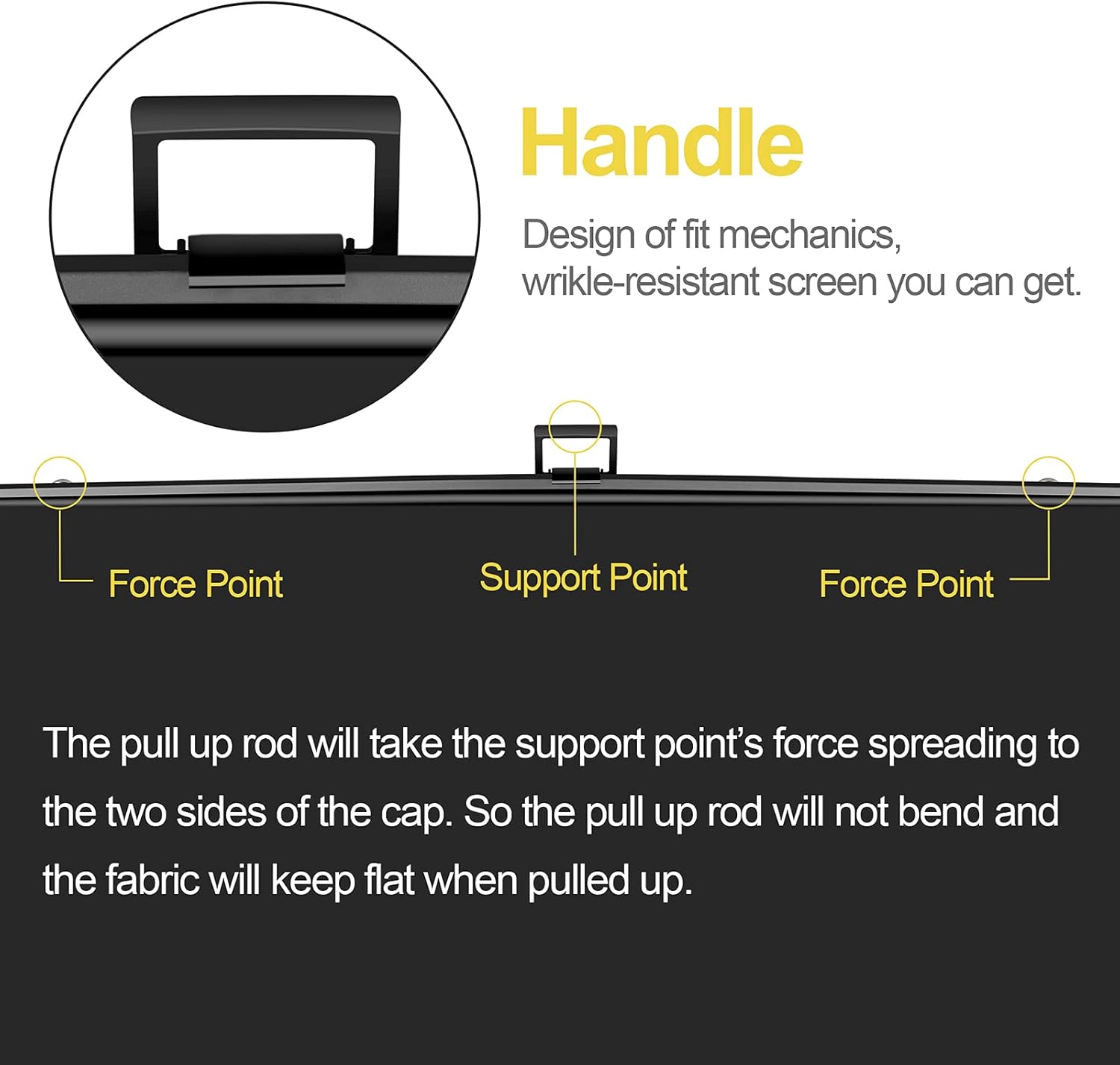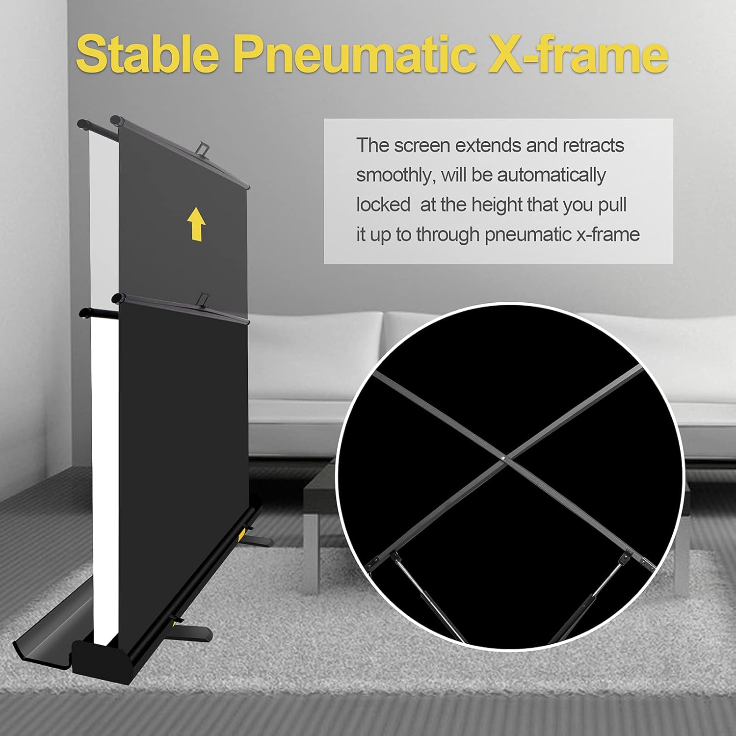 - 【Ultra Quick Setup】Just unfold the 2 built-in legs, open the latches, pull the white & black screen upward with the handle, you are set it easily and quickly. The pneumatic x-frame automatically lock design will hold the backdrop at whatever position you pull it up.