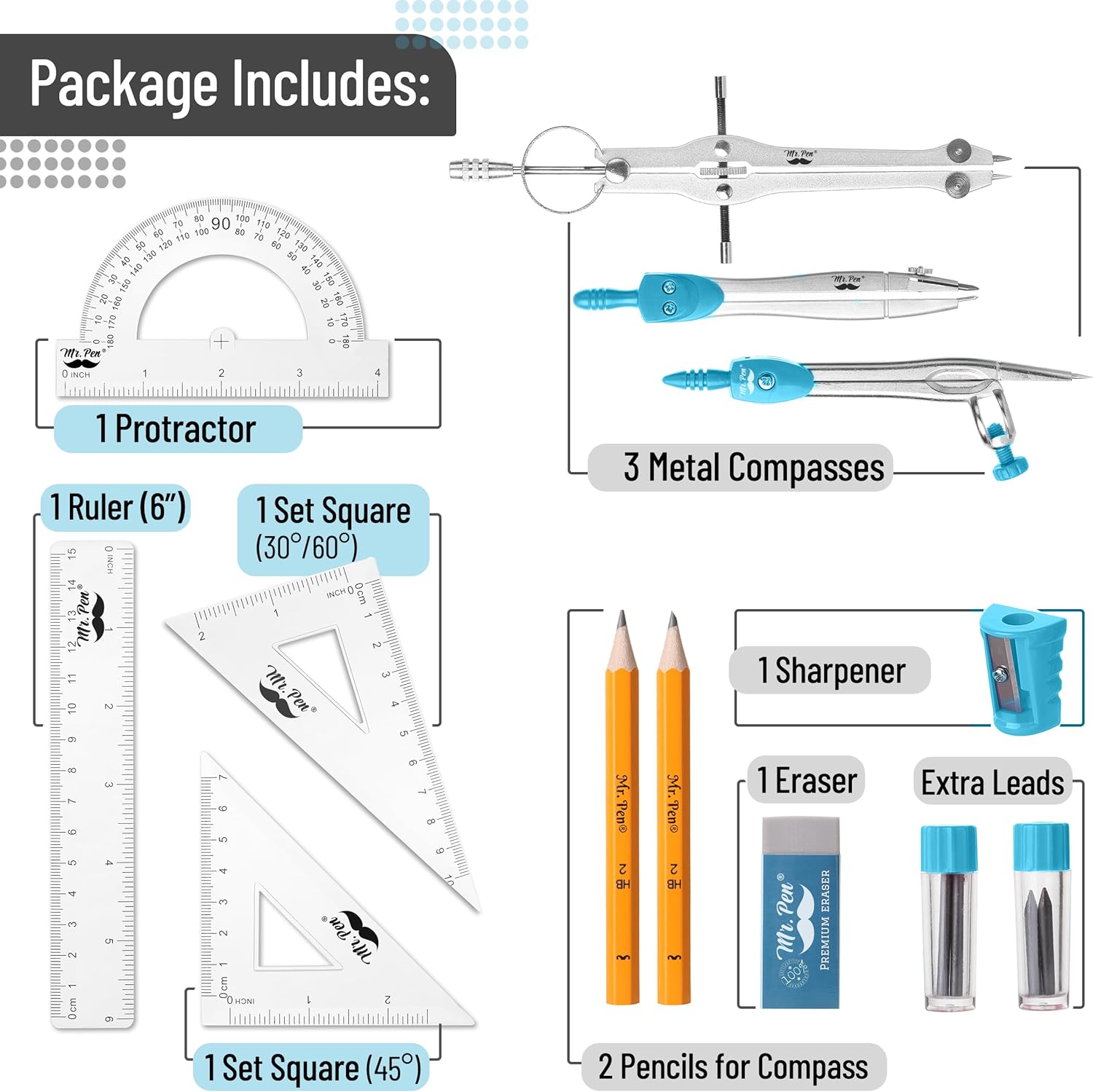 - Complete Geometry Set: Includes compasses, triangles, ruler, protractor, pencils, sharpener, eraser and lead refills