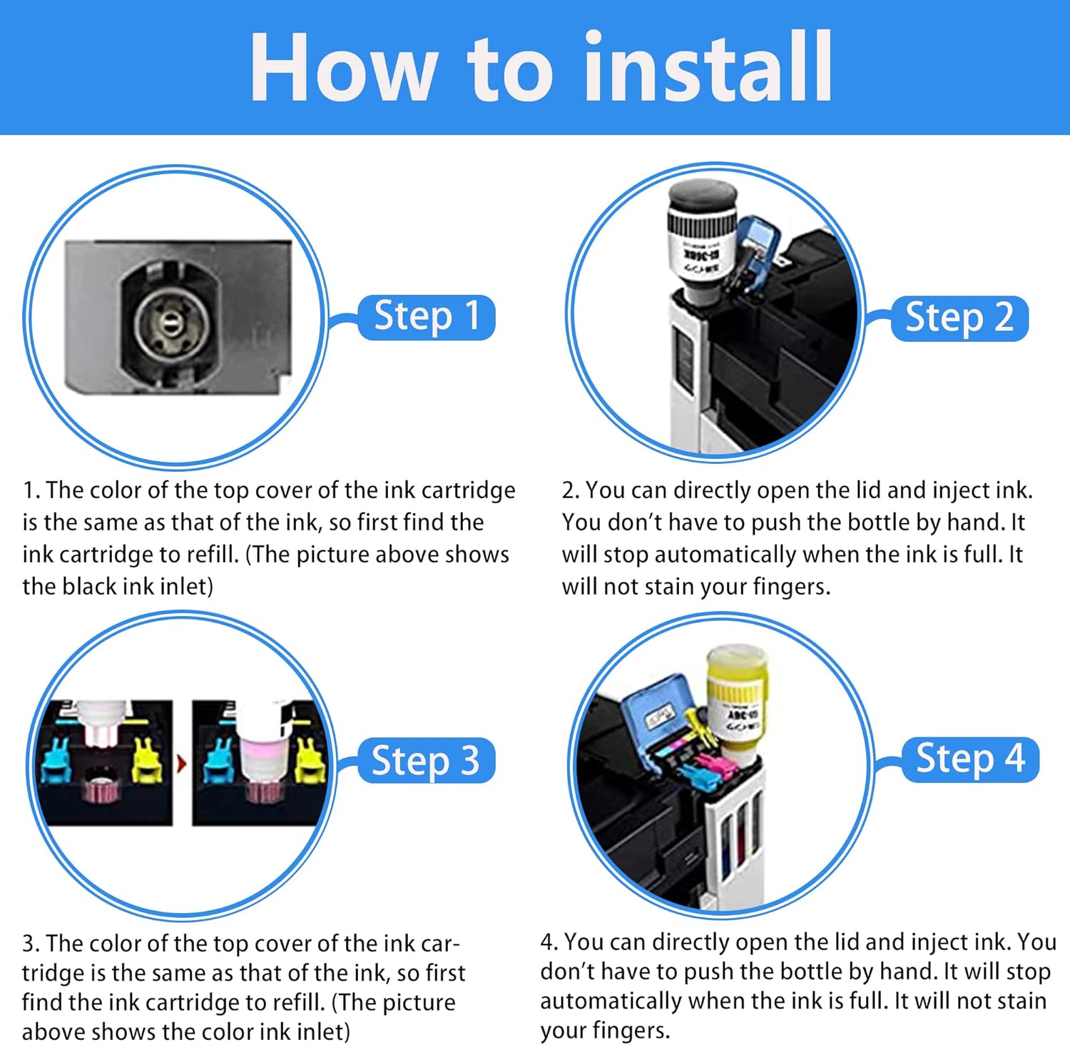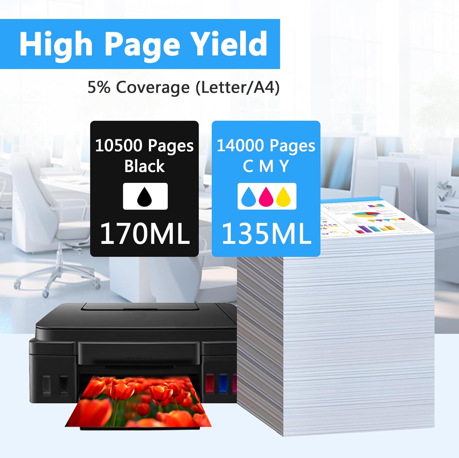 - Package Content: Total 4 ink bottles (1 Black+1 Cyan+1 Magenta+1 Yellow); The capacity is 170ML per black ink bottle and 135ML per color ink bottle. 10500 pages per black ink bottle and 14000 Pages per color ink bottle at 5% Coverage (Letter /A4).