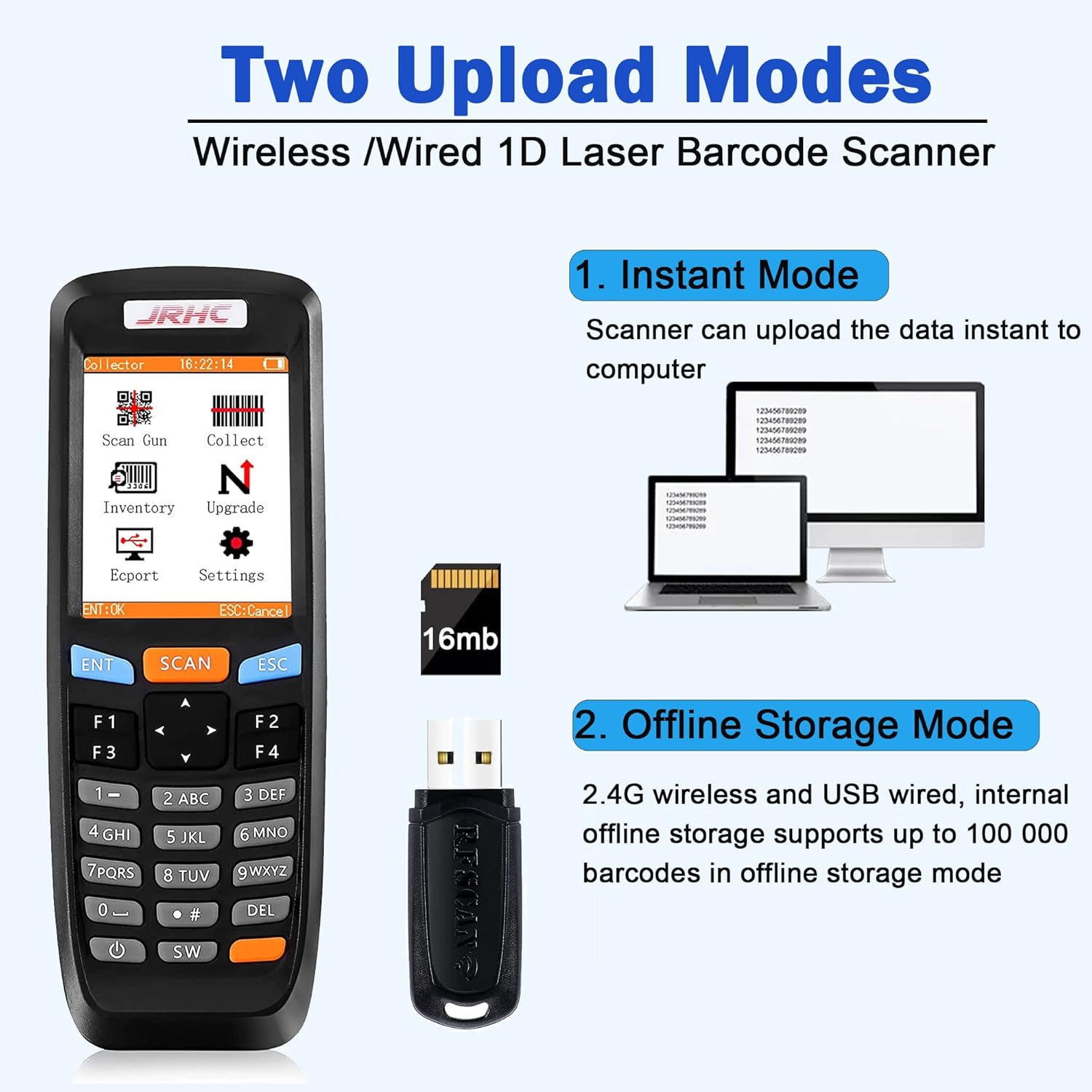 - 1000MAH Large capacity battery: This scanner gun for inventory has a built-in lithium polymer battery, which can be charged with a USB data cable. The capacity is 1000MAH, and it can be fully charged in about two hours. It can be used for 20-40 hours to increase your workload.