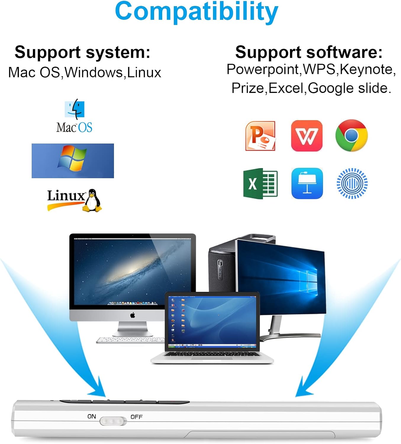 - [High compatibility] Demonstration remote control can support systems: Windows/XP/Vista/7/8/10, Mac OS, Linux, Android. The software supported by the wireless presentation clicker are: PowerPoint/Keynote/Prezi/Word/Excle/ACD See/iWork.