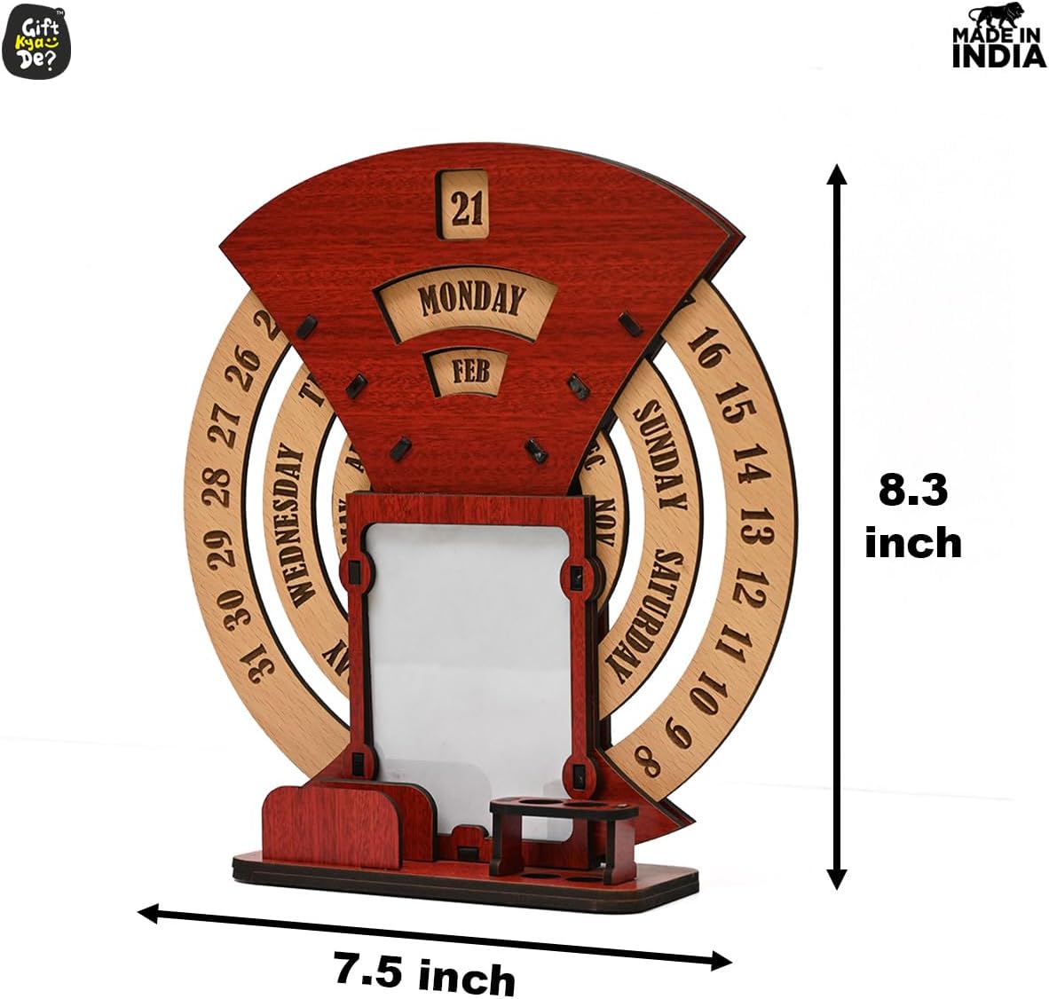 - Designer Home Decor: The beautiful designer calendar 2023 , where you can keep your photo, pen, and cardholder that serve as the perfect piece of home and office decor. Three individual circular rings dedicated to dates, days, and months are placed in an indigenous manner, which may be rotated very easily and precisely to change days, dates, and months to give you a new day every day. This calendar for desks is not limited to any particular year.