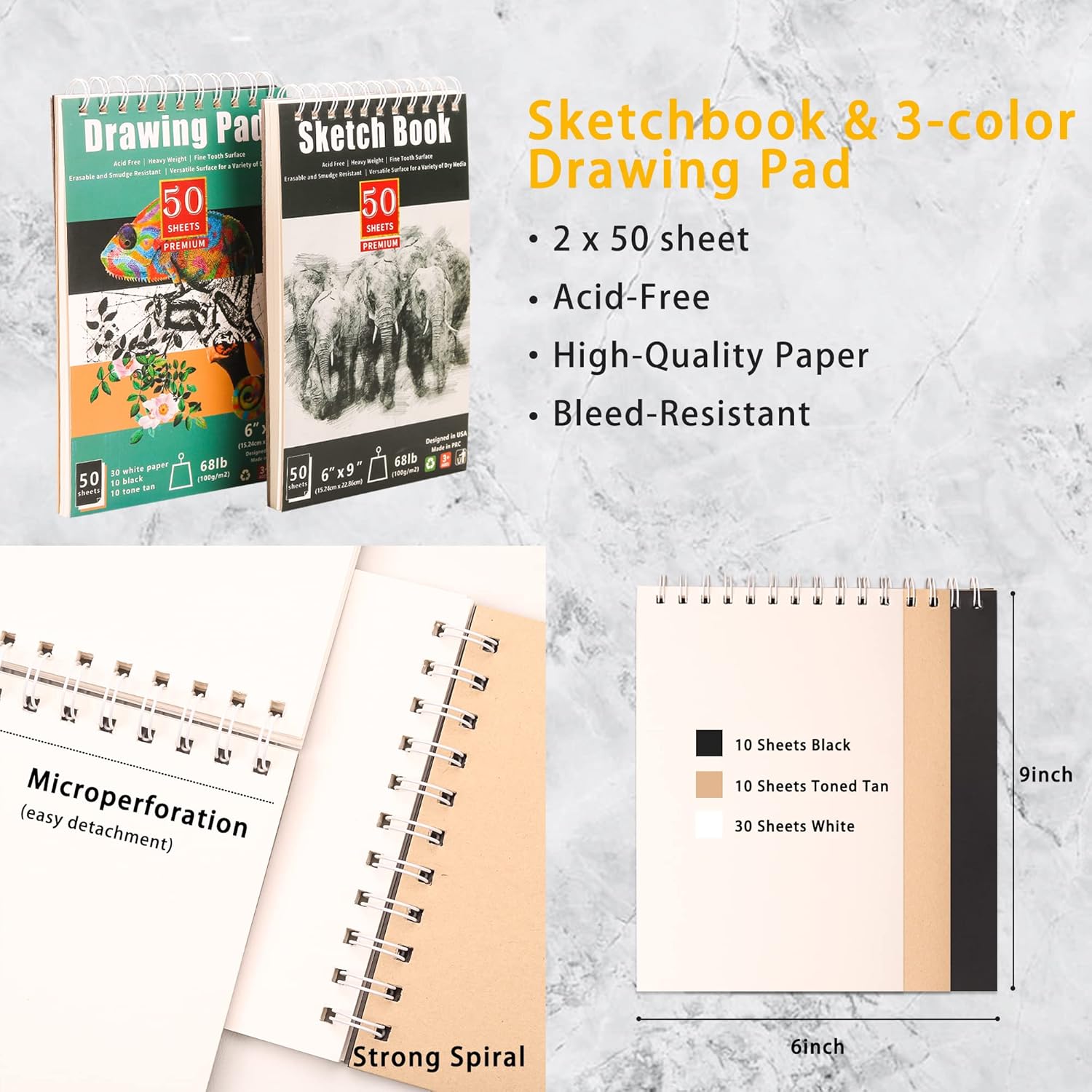 - Premium Sketchbook: Made of heavyweight and sturdy paper with a toothy surface to grab dry media like graphite, colored pencil, charcoal, sketching stick, and soft pastel for creating art.