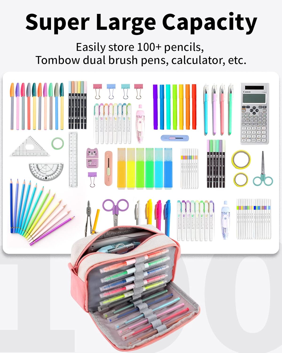 - Truly Large Capacity: Quite probably the biggest one you can get. Roomy storage, easily hold up to 100 pencils and supplies as scissors, calculator, rubber, even portable charger. Perfect size, fits +all the thing you need for daily work and study. Age of Application: 3 yrs+.