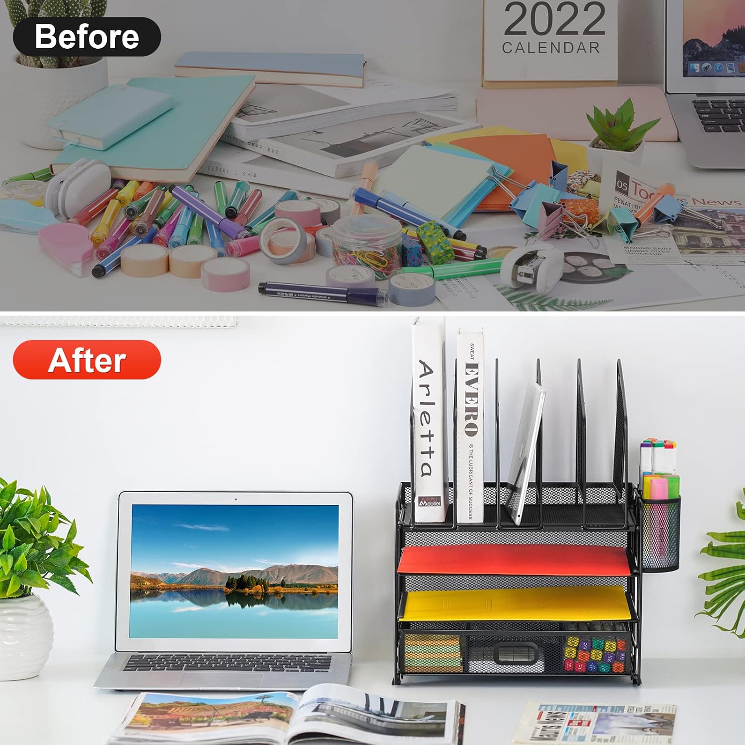 - 【Space Saving】Outfit your space with the Hanging Pencil Holder (Built-in Hooks) and top vertical file folder holder, which offers everything you need and make the most of your vertical and horizontal space to keep your desk neat so you can stay on task and do great work
