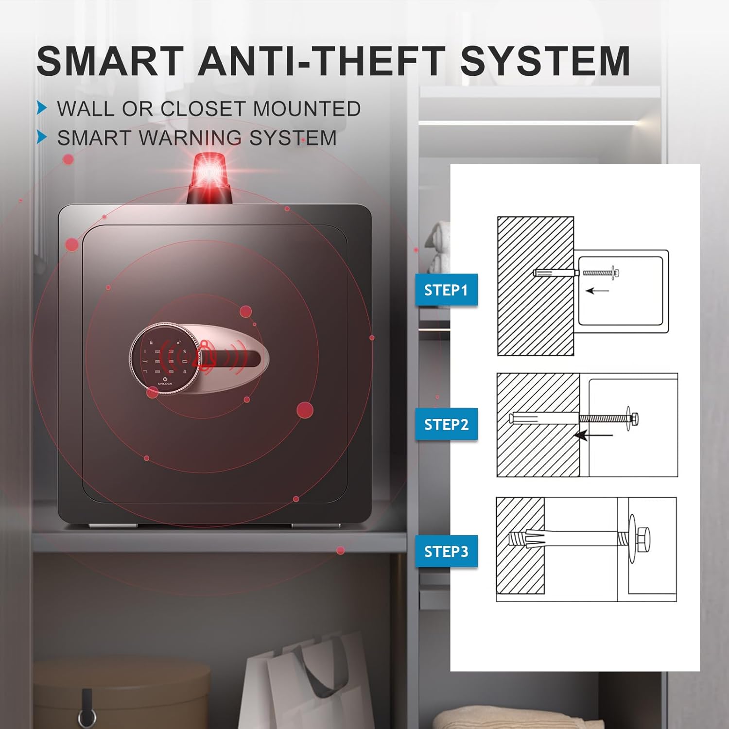 - ăANTI-TAMPERING ALARM SYSTEMăThis safe box has double alarm system, wrong password alarm will be activated after 5 consecutive wrong password, the system will alarm and locked for 60 seconds; If the safe is violently moved or hit, vibration alarm will be triggered, enter the correct password to cancel the alarm.
