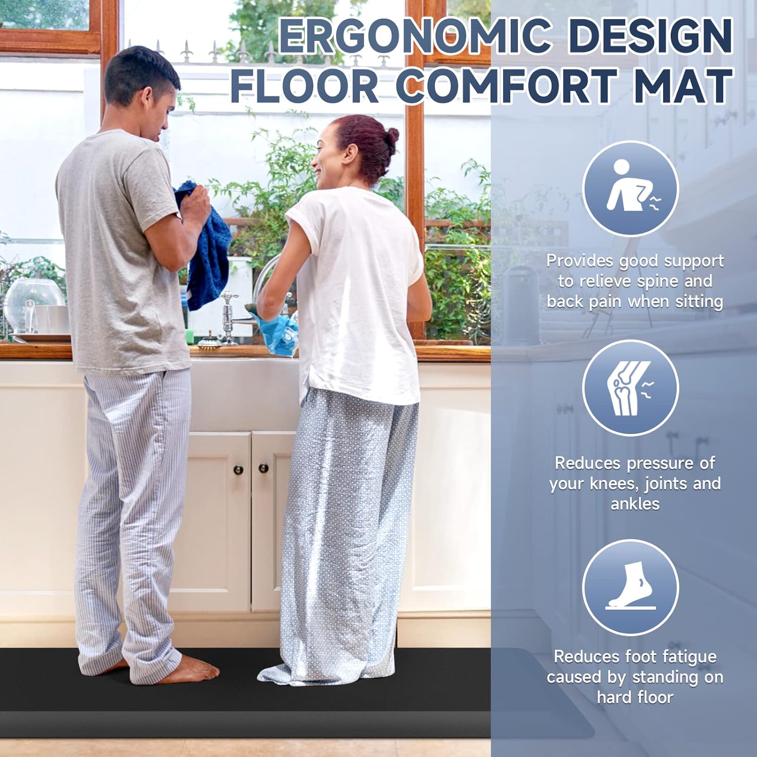 - 【Anti-Fatigue】Comfort floor mat provides comfort when standing. Reduces pressure on knees and ankles. Relieves back and spine pain when standing and relieves fatigue caused by standing for long periods.