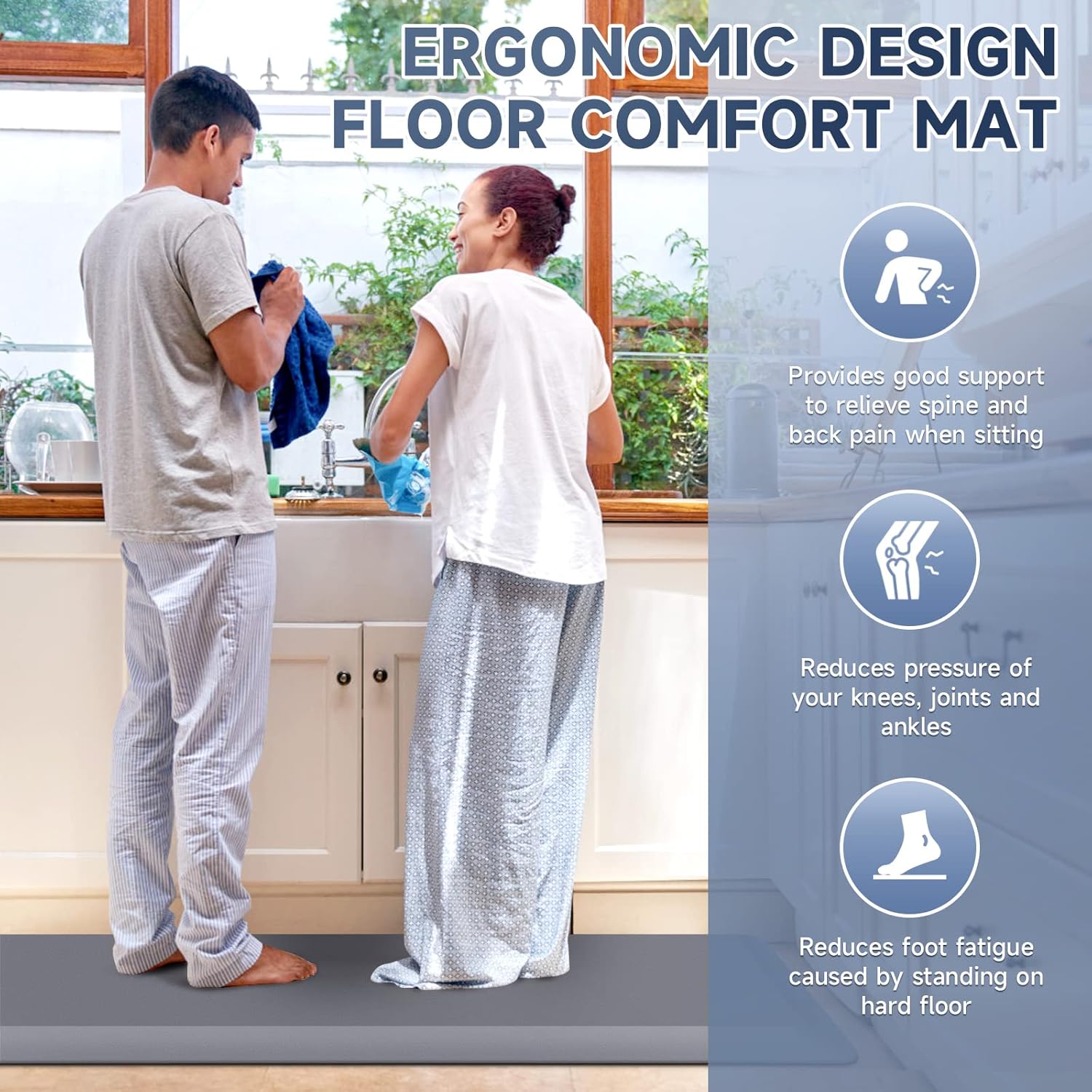 - 【Anti-Fatigue】Comfort floor mat provides comfort when standing. Reduces pressure on knees and ankles. Relieves back and spine pain when standing and relieves fatigue caused by standing for long periods.