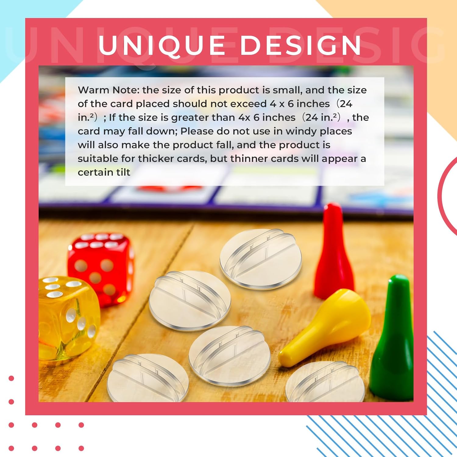 - Warm reminder: The product is made of plastic, small and lightweight. The size of the card placed should not exceed 4 x 6 inches or be too heavy; otherwise, the card slot may tip over. Do not use it in windy places either. The wind can also cause the product to tip over.