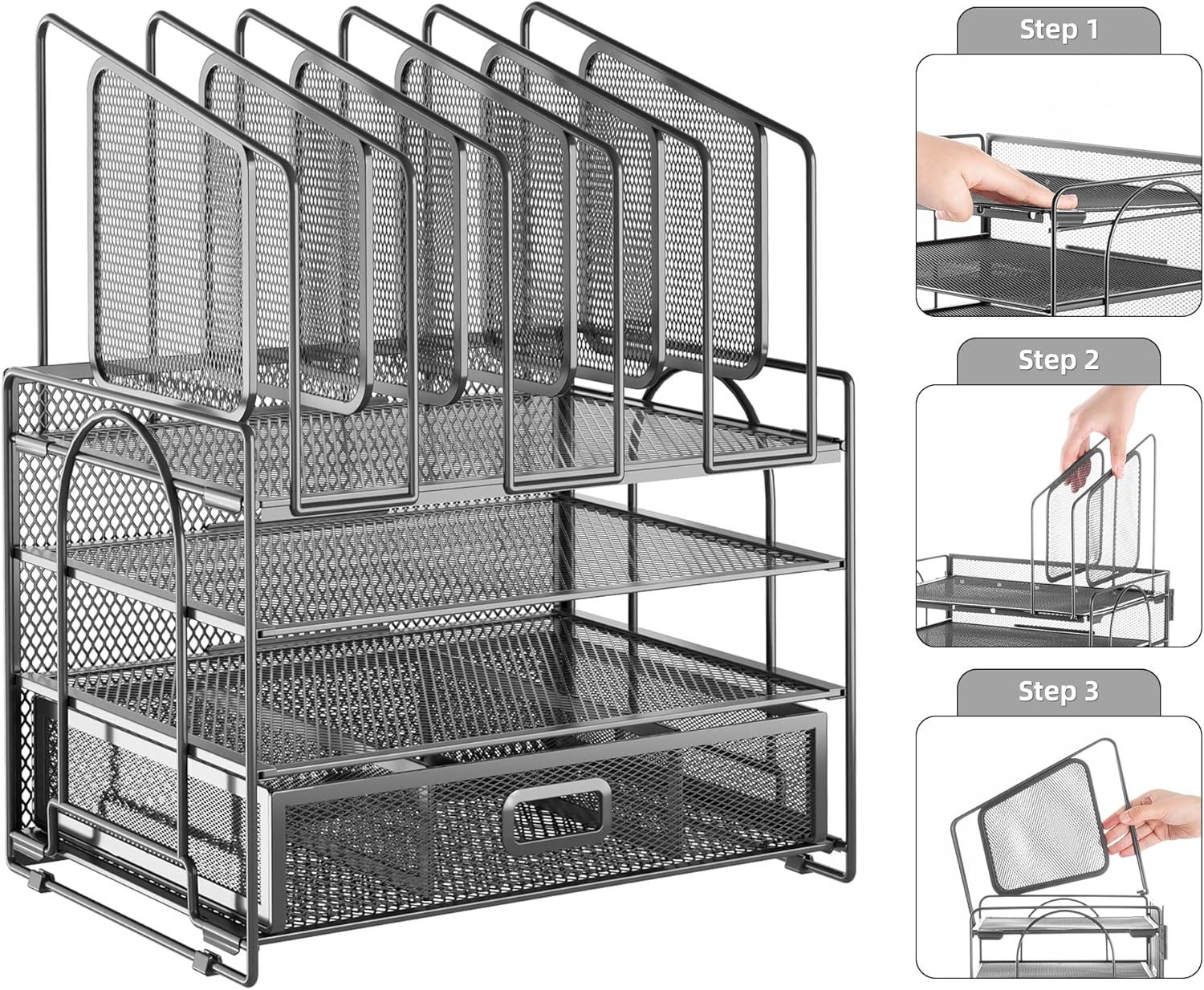 - 【Multifunctional Desk organizer】Marbrasse upgrade desktop file organizer has vertical and horizontal storage space – 4 sliding trays +5 vertical sorters +3 compartments drawer+ additional 2 pen holders . Upright section has five 3" Compartments for magazines, bill, file, book. Three types of use to meet your various office needs!!