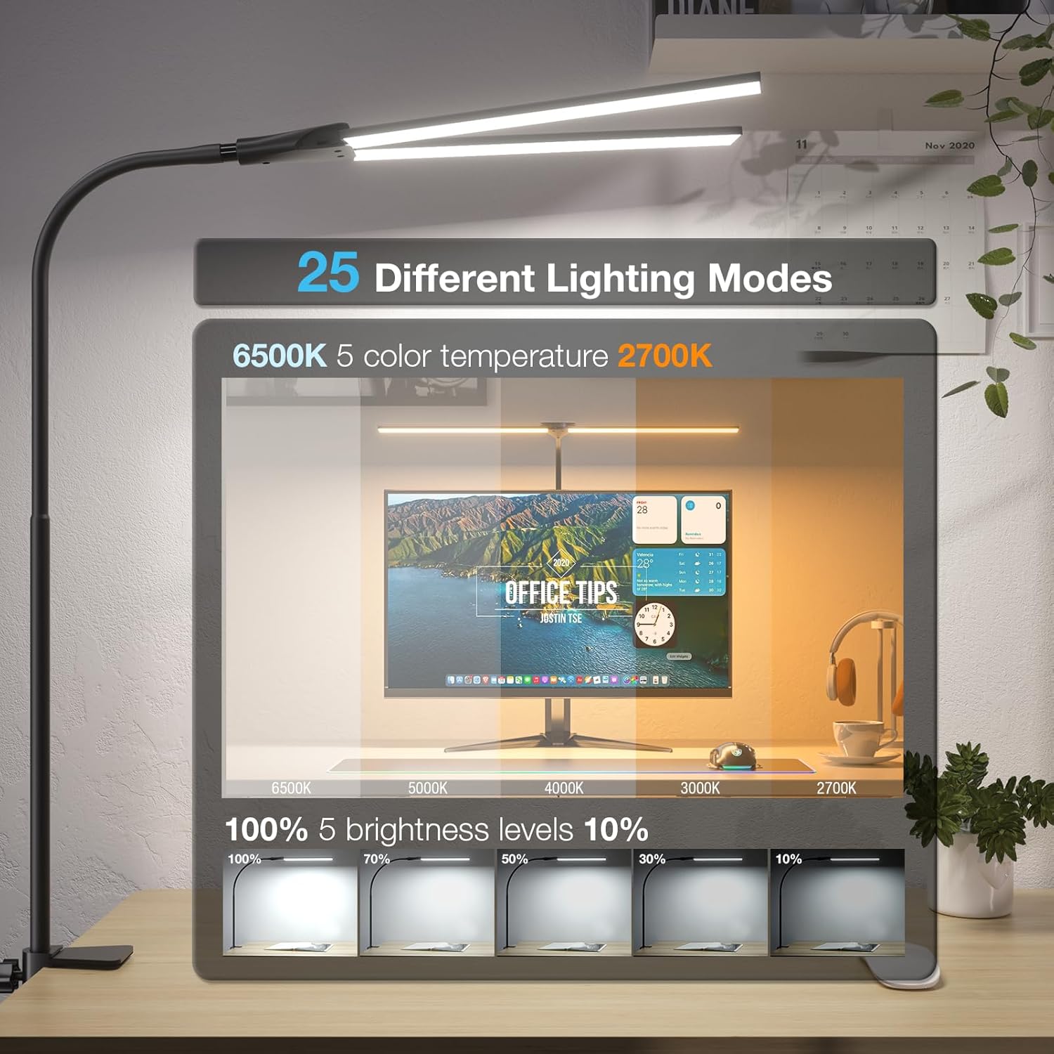 - Double Head LED Desk Lamp: The desk lamp with clamp has a double-headed design, which can extend the angle of the desk light bar freely within 180°. The office desk lamp is high-quality aluminum and wrapped with silicone coating, which is scratch-resistant and lightweight. The maximum height of the clamp is 2.6 inches. Clip is equipped with a protective pad, which is sturdy and non-slip to avoid scratching the table