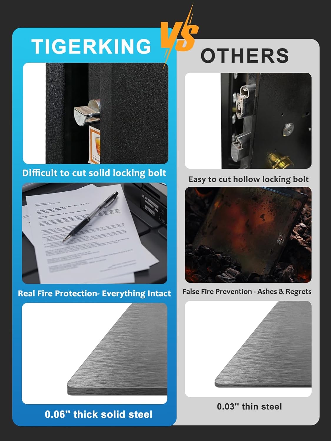 - Tamper Alert & Lifetime Support: Worried about tampering? The alarm system activates after 3 wrong entries or strong vibration—deactivates with fingerprint or PIN. TIGERKING provides a one-year warranty for customers. This digital security safe is built for protection.