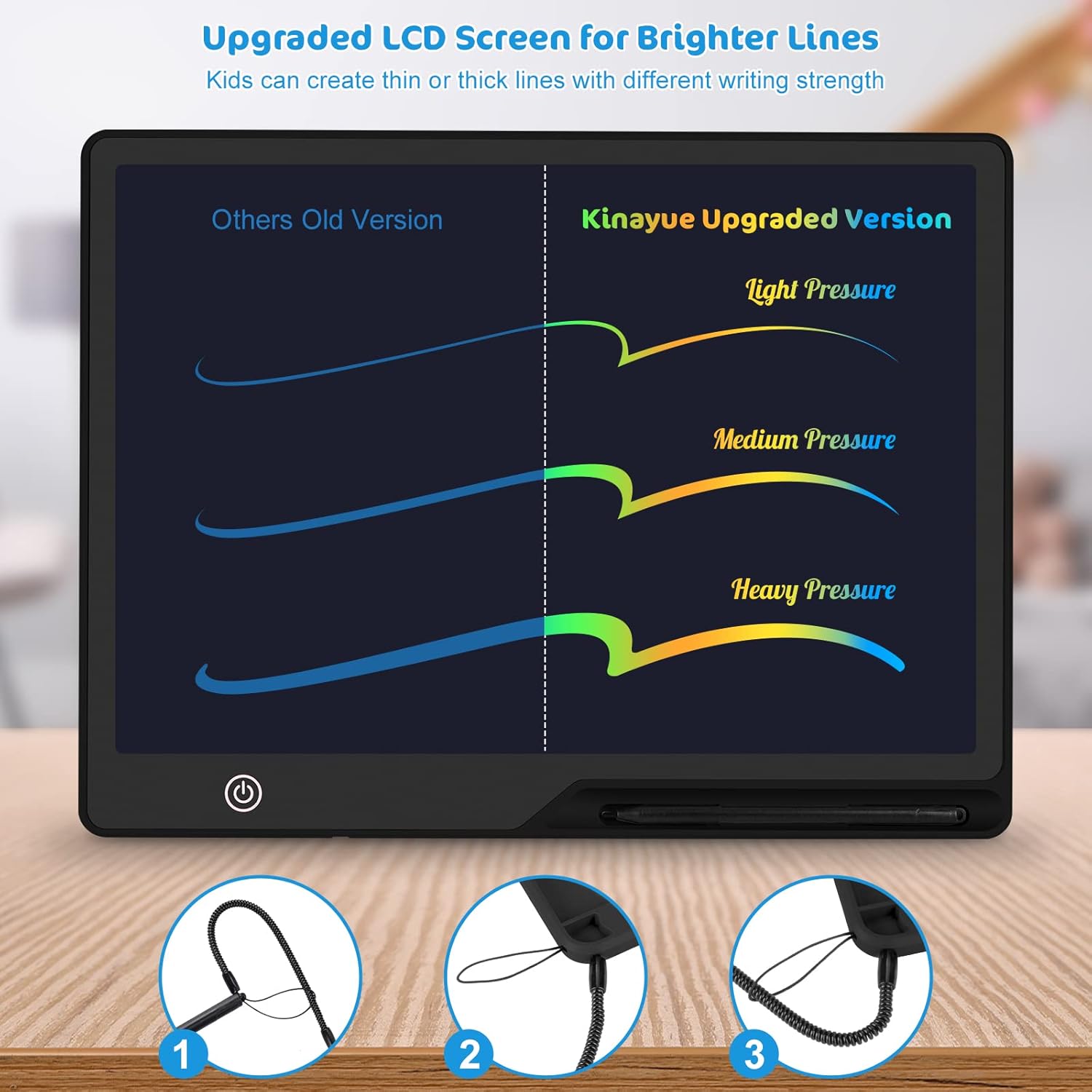- 16 INCH EDUCATIONAL TOYS & TRAVEL TOYS KITS-As kids growing, they need to learn about color, space and shape through drawing, Kinayue’s LCD doodle board provides a ultra large 16 inch screen, offers enough space for graffiti and easy viewing, free kids imagination and record every moment of inspiration. Lightweight design with long-lasting battery lifespan makes it perfect travel essentials to draw out what's in mind When inspiration strikes on the journey.
