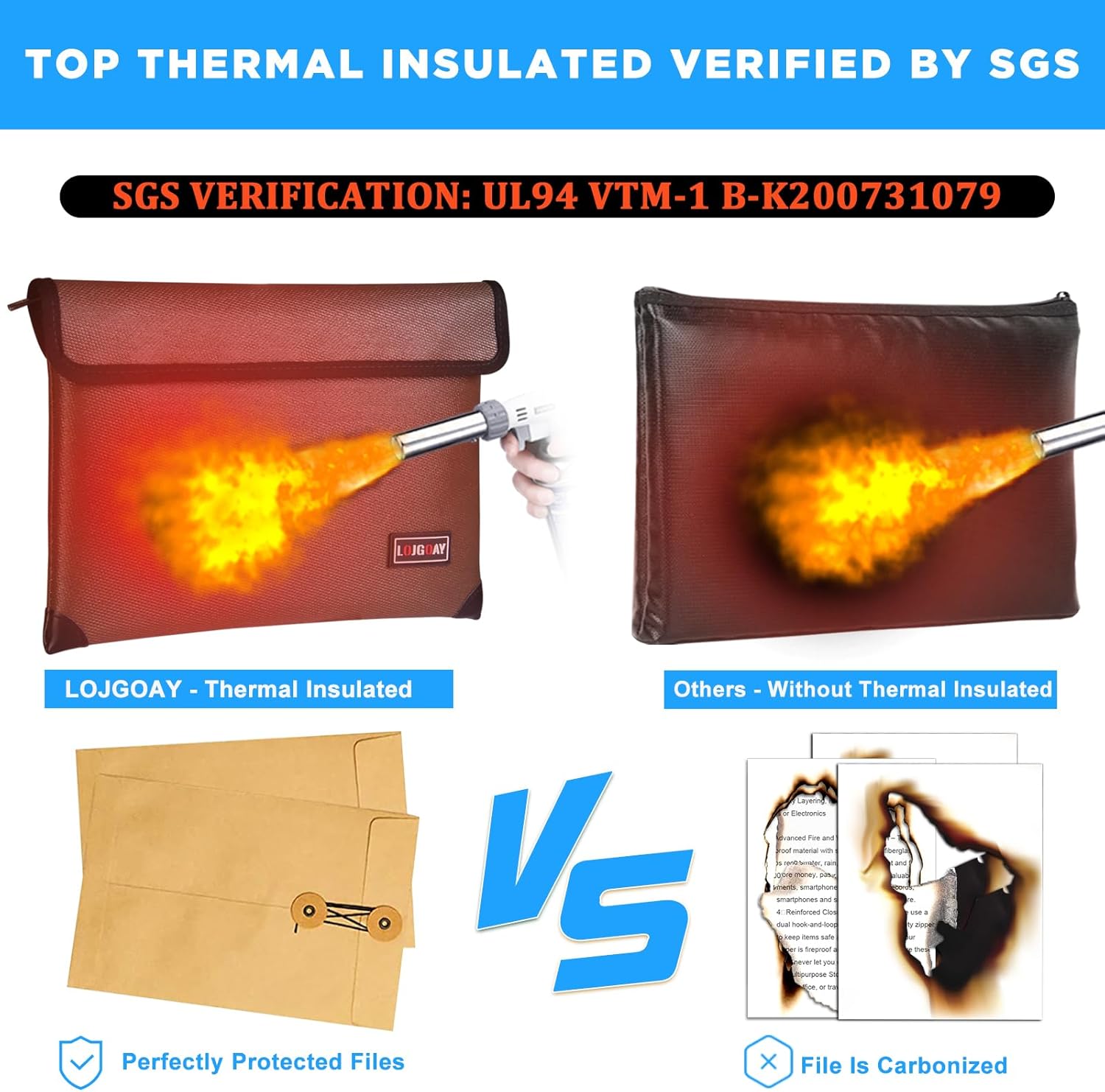 - 🔥TRUSTED FIRE PROTECTION : The fireproof waterproof document bag has passed Global Flammability Standards (US labs) and Vertical Combustion Testing (SGS UL94 V-1). Fireproof money bag can withstand ultra high temperatures up to 5200°F