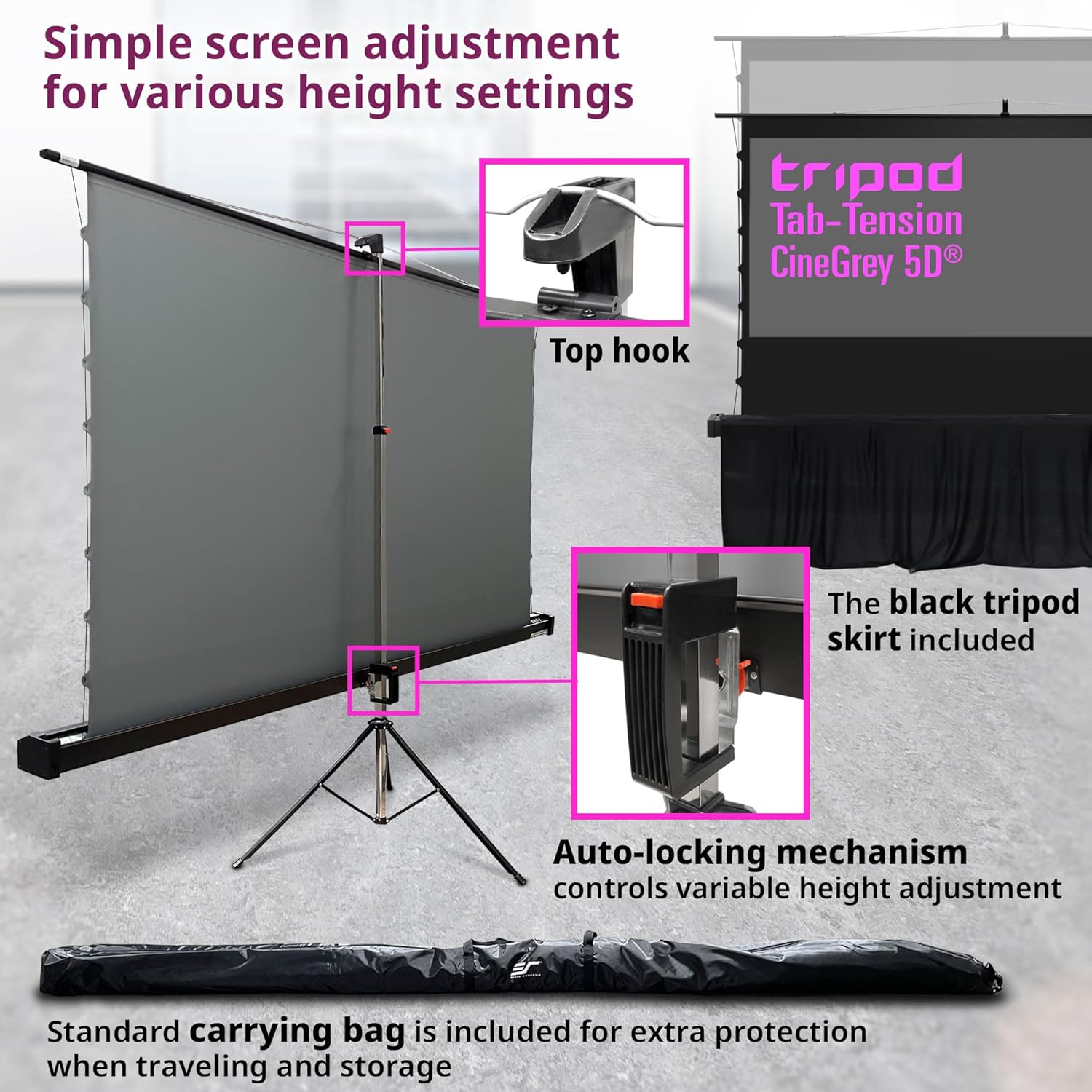 - [FEATURES] : a tab-tension system that prevents wrinkles and ensures the flattest possible viewing area. Manual locking mechanism provides a wide range of height settings and easy operation. Portable Tripod Pull-Up Screens for Lights on Presentations with Standard Throw Projectors