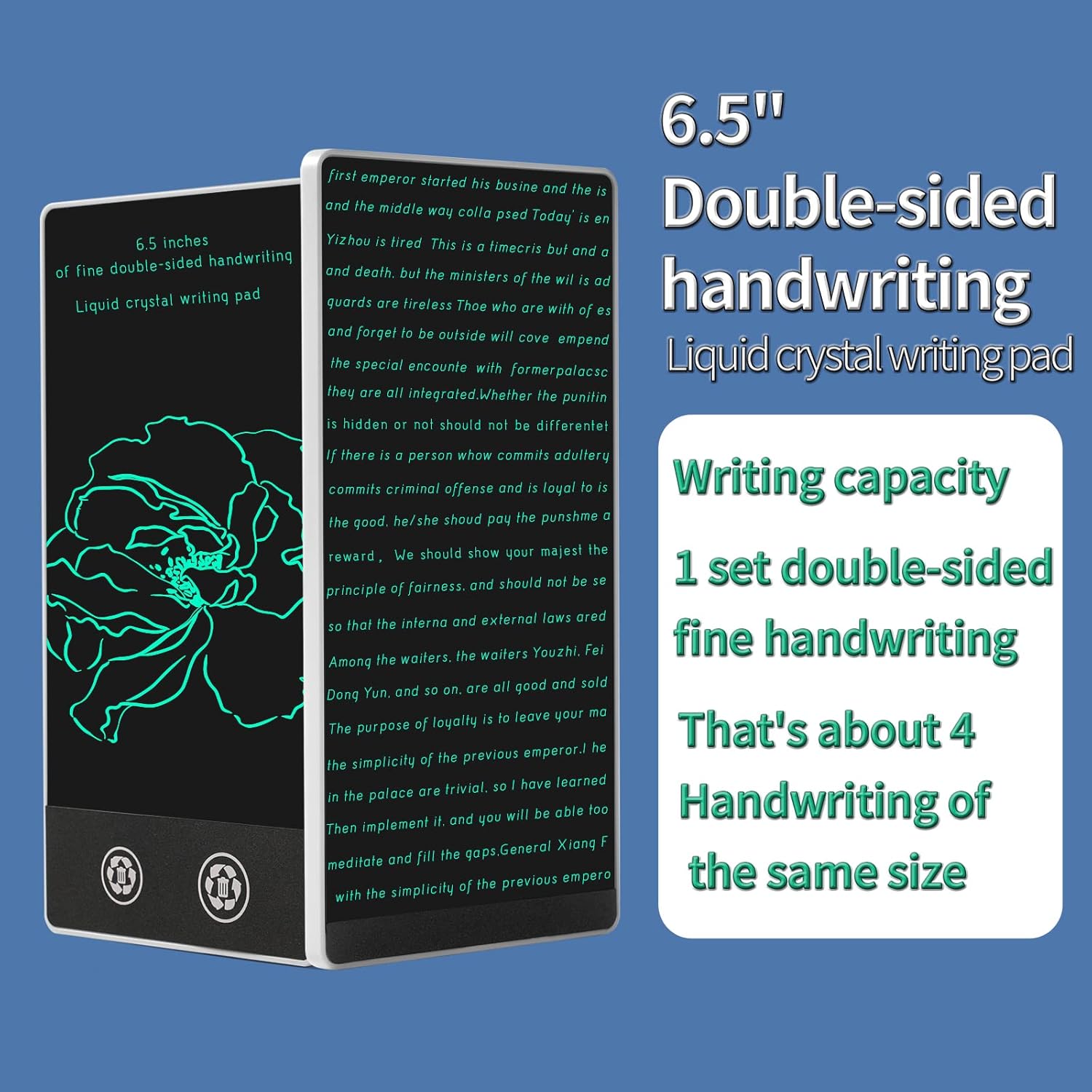 - 【Ultra-Slim Design】 Our LCD writing tablet features a phone-like slim body (only 0.2 inch thin) with rounded corners, crafted from durable ABS material. At just 0.11 lb, this lightweight digital notepad fits perfectly in one hand. Double-sided design with 6.5-inch screens maximizes functionality - use one side for work, another for personal notes.
