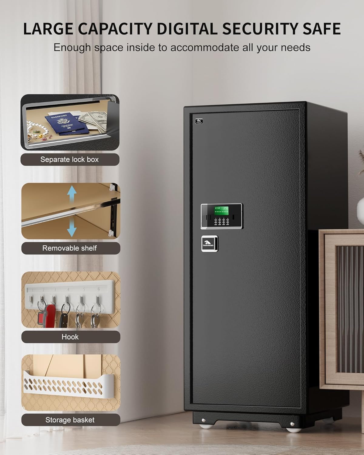 - ✅【REMOVABLE SHELF AND LOCK BOX】: The inside of the safe is covered with leather to prevent valuables from being worn. Removable shelves allow you to move up and down to accommodate the items you want to store. The digital safe has interior box with lock, even you need share your safe with others, you still can have a secure place to load your own valuables such as cash, jewelry, passport, offer another layer of protection.