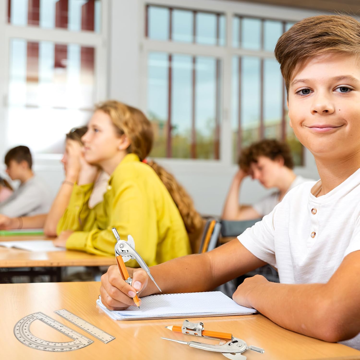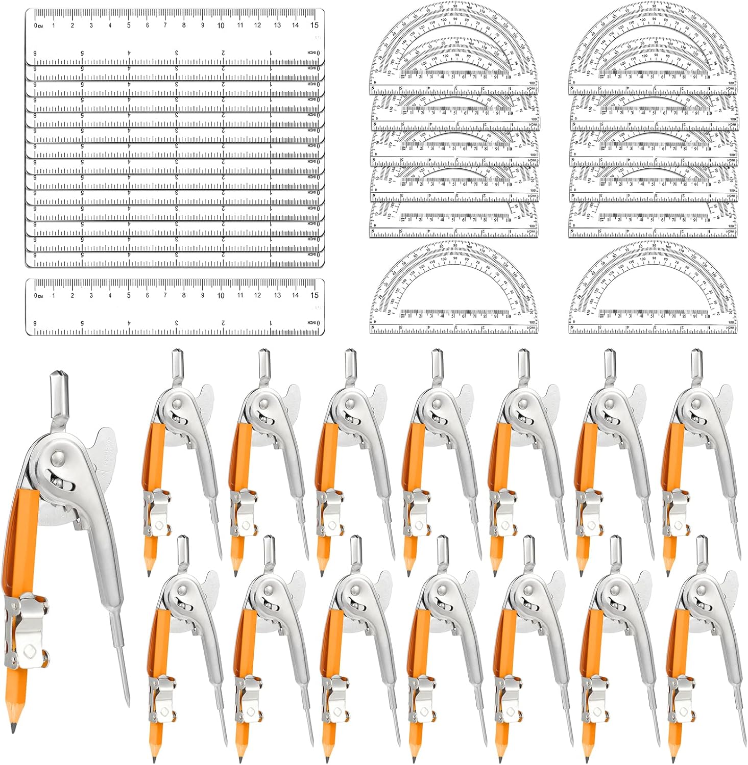 - Comprehensive Math Tool Set: this math compass combination set includes 15 pieces metal math compasses, 15 pieces pencils (which have been installed on a compass for your direct use), 15 pieces geometric protractors and 15 pieces rulers, providing ample quantities for everyday use or sharing with family and friends
