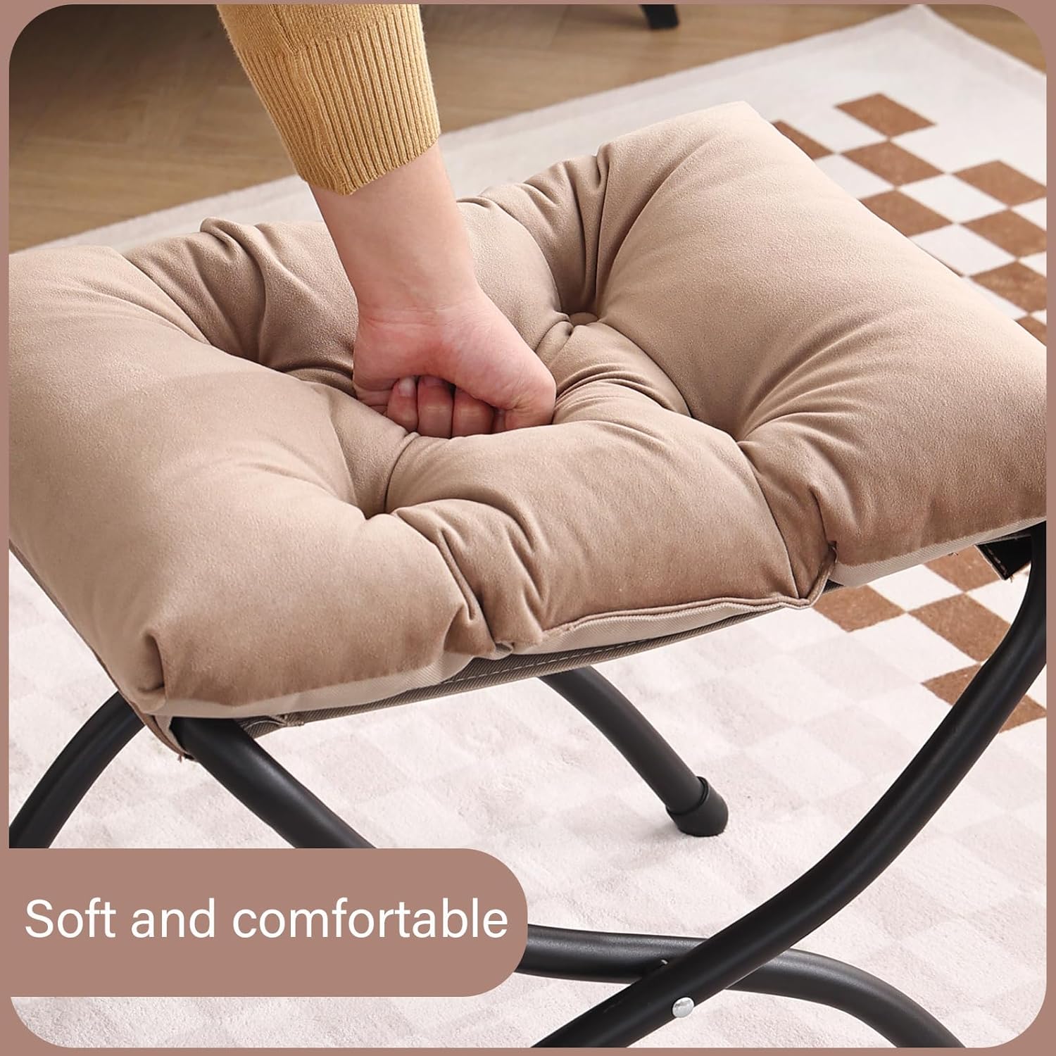 LITA Folding Upholstered Footrest Stool, Modern Small Portable Accent Ottoman with Detachable Thick Cotton Cushion Padded Sofa Stool with Metal Frame for Lazy Chair, Living Room & Bedroom, Khaki