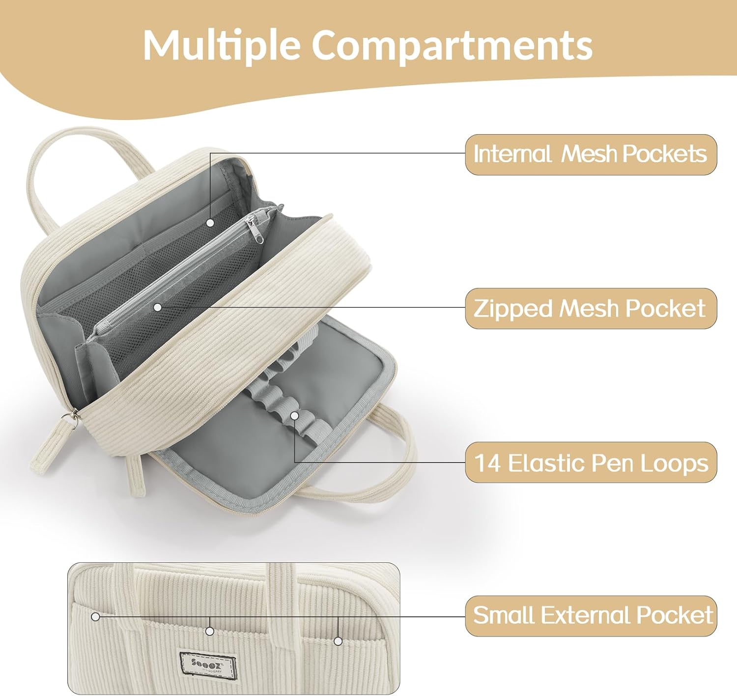- Efficient Organization: The pencil bags features 5 Compartments, including 3 mesh pocket, and 1 zip mesh pocket, 1 zip pocket with 14 elastic pen loops. It provides ample space to store and organize your school supplies, makeup items, sewing accessories, or electronic gadgets.