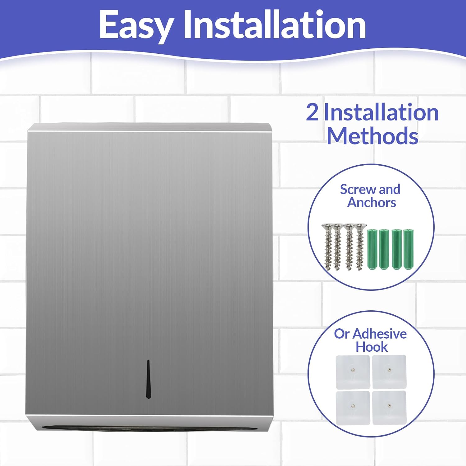 - Two installation Method - Easily install the paper towel dispenser using the provided screws and anchors, Or no drill on the wall and mount using Adhesive Hooks (NOT in other brands)