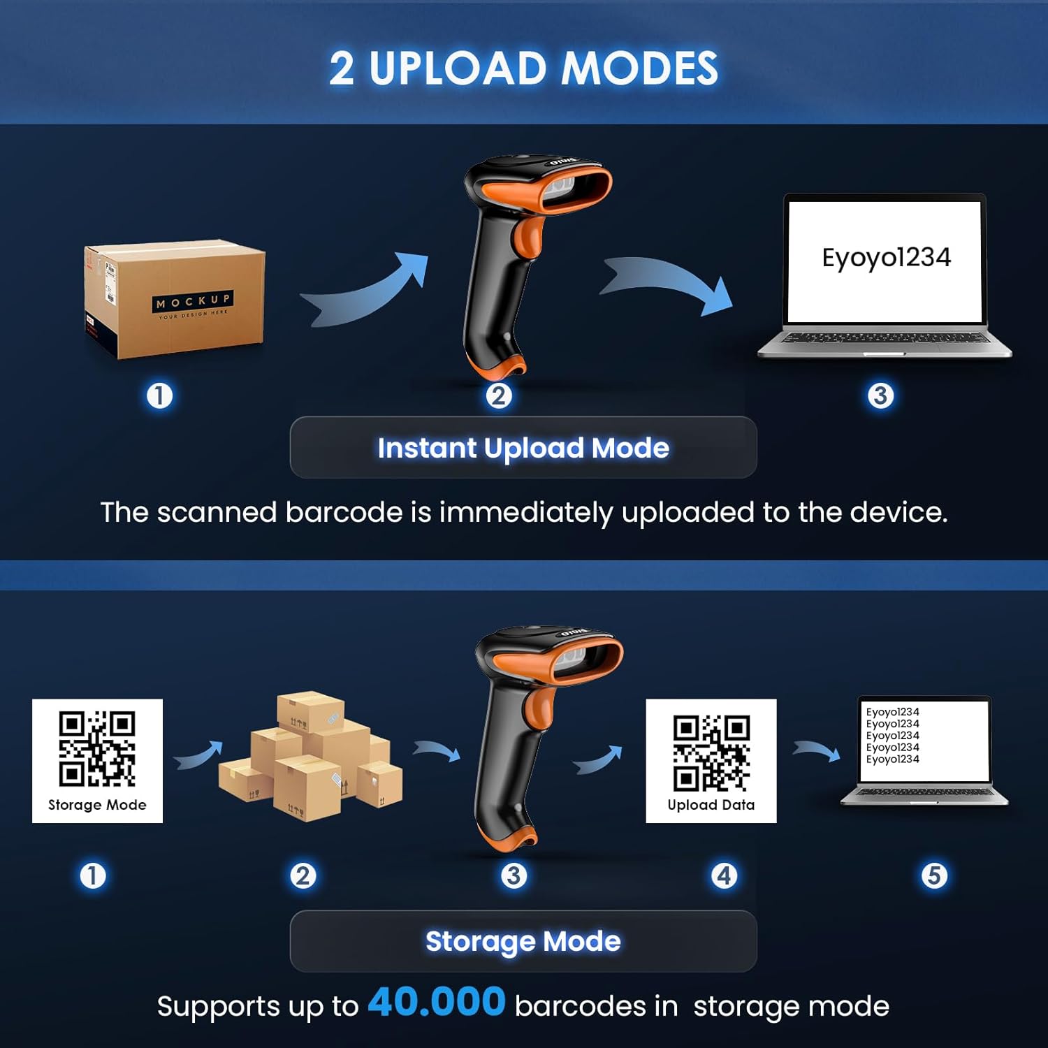 - Prominent Scanning Ability: 32Bit CPU super decoding ability that speeds up to 300/sec, Eyoyo upgraded barcode scanner stands out on the market for its fast accurate reading speed, with advanced sensor, which can instantly capture 2D 1D codes from paper and screen, including CODE128, UPC/EAN Add on 2 or 5, and even deformed, smudged, damaged, fuzzy, reflective ones