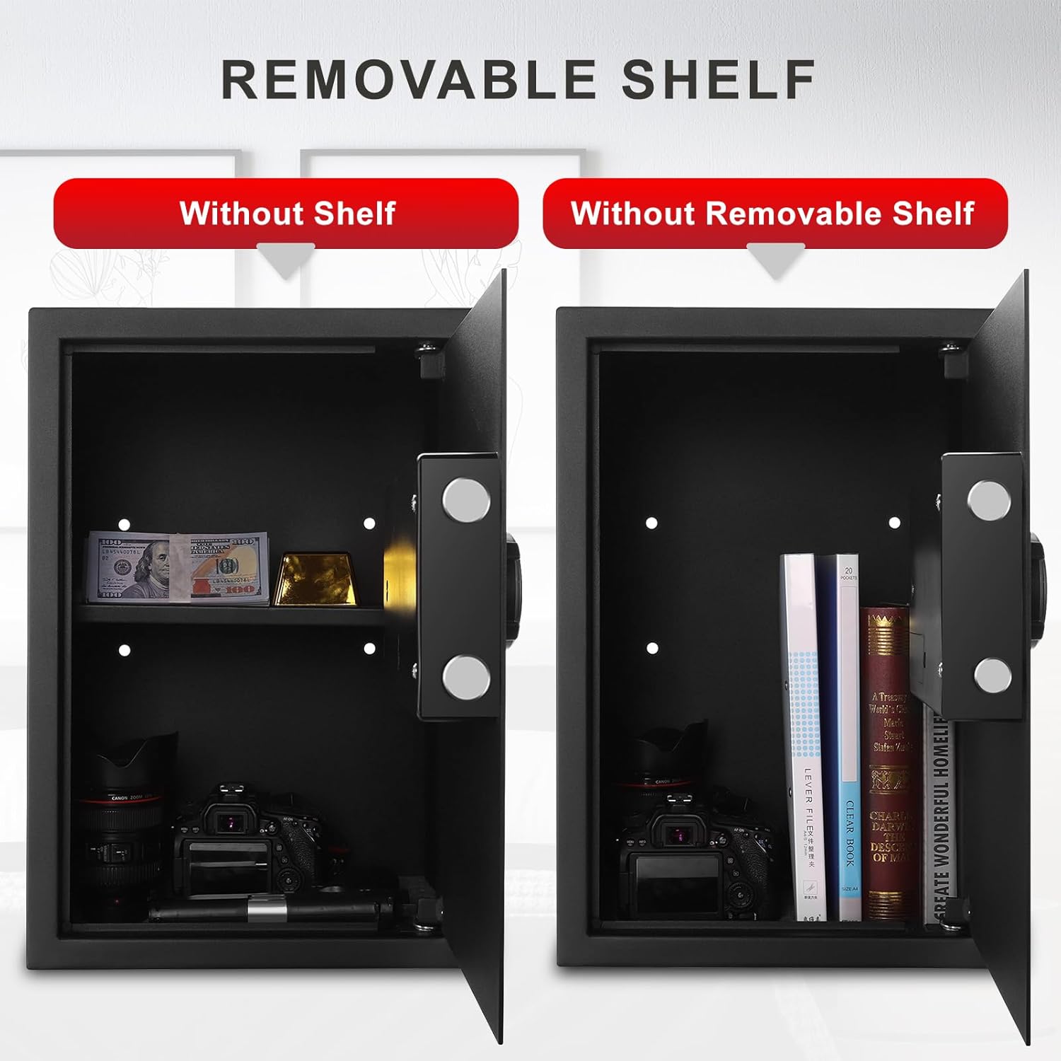 - 【LARGE CAPACITY WITH REMOVABLE SHELF】: 1.8 c.f large capacity with removable shelf provide flexible storage solutions to meet different product sizes, like cash, jewelry, 14'' laptops, pistols, documents and other valuables. The external size is 19.68''x 13.77''x 11.81'', interior size is 19.57"×13.66"×10.63".