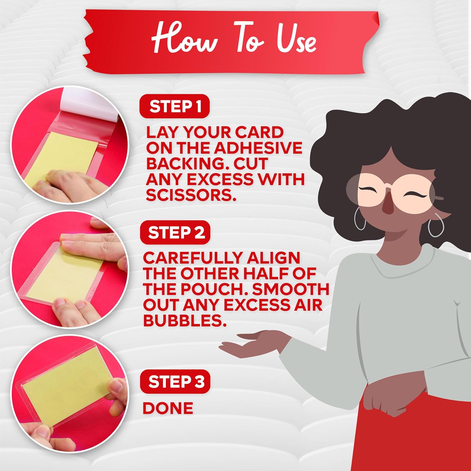 - NO MACHINE NEEDED. Our self sealing laminating pouches do not require a thermal business card laminator thanks to its peel-and-stick self-adhesive surface, delivering quick and EASY-APPLICATION yet PROFESSIONAL-QUALITY lamination.