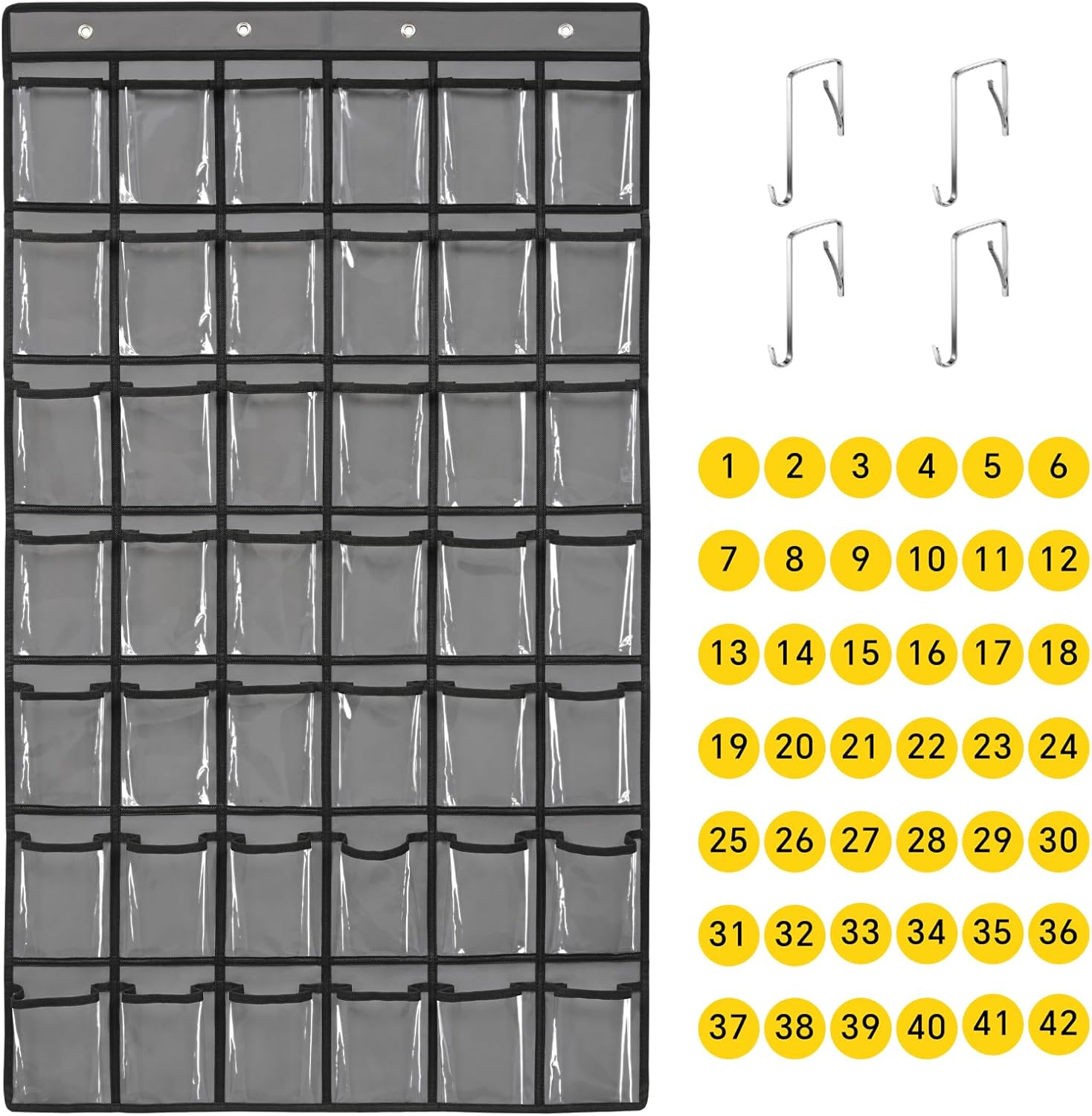 42 Pocket Classroom Pocket Chart for Cell Phones and Calculator,Clear Cellphone Pocket Chart for Classroom with Number Sticker and Hooks (Grey-42 Pockets)