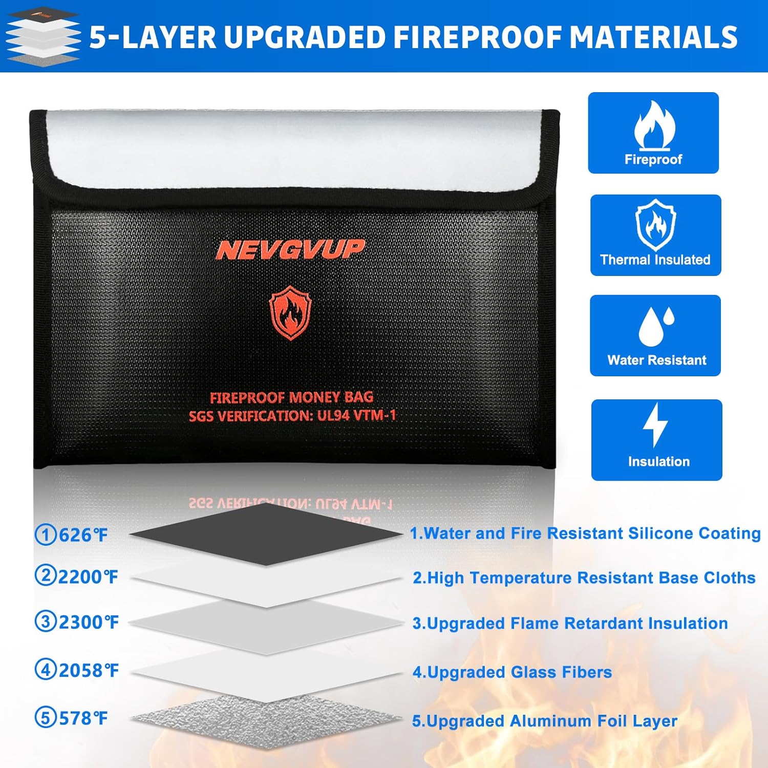 - Fireproof Design: Nevgvup's fireproof document bag adopt totally 5-layer function material of fire protection and heat insulated, which is sewn with flame-retardant thread and fireproof hemming to prevent fire from damaging fireproof bag from the edge, withstand temperatures up to 4200°F