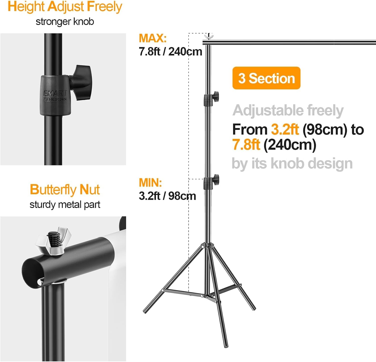 - 【Adjustable Height&Width】With adjustable height (3.2ft/98cm–7.8ft/2.4m) and width (5ft/1.5m-10ft/3m), the backdrop support system holds your backdrop in place and helps create different backgrounds for photography work.