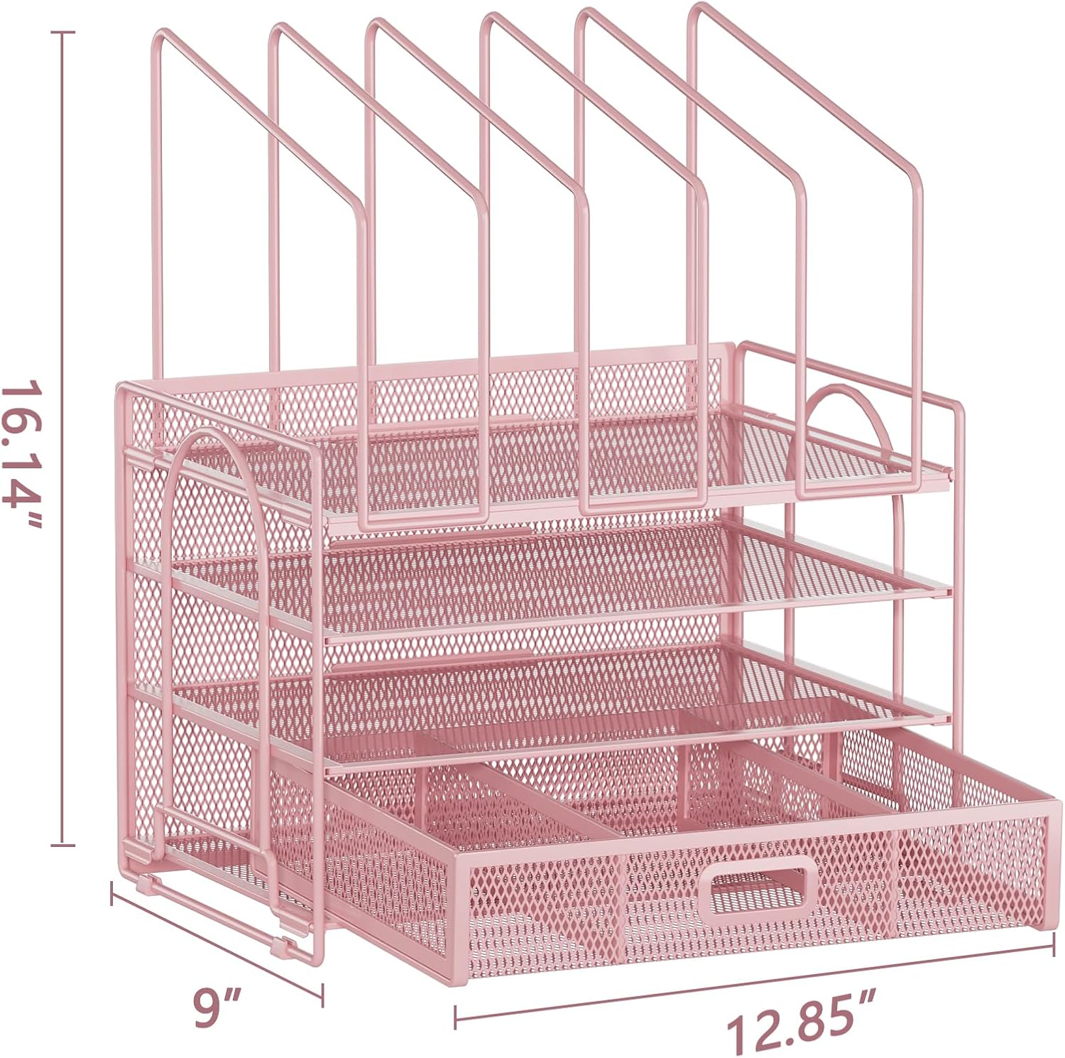 Marbrasse Desk Organizers, 4-Tier Mesh Desk File Organizer with 5 Vertical File Holders and 2 Pen Holders, Multifunction Desktop Organizer,Desk Organizers and Accessories for Home Office (Pink)