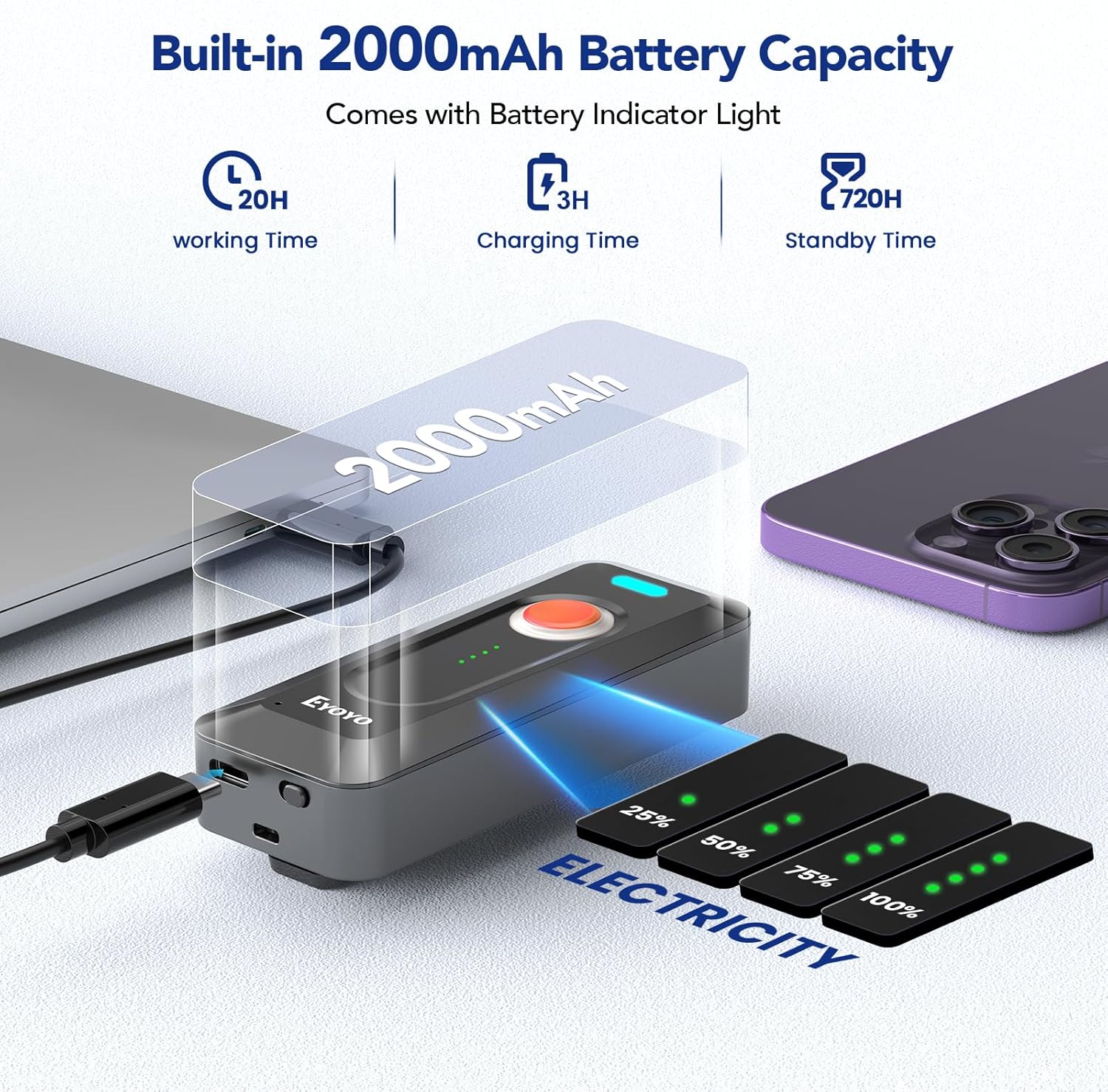 - 2000mAh Rechargeable Battery with Battery Level Indicators: The large battery capacity supports you to work continuously for over 20 hours, while only requiring 4 hours of charging time via USB-C port, which safeguards your work. Meanwhile, the power indicator design keeps you aware of the remaining power at all times (25%-50%-75-%-100%), no more Low Battery Anxiety. This 2D barcode reader will be your good helper