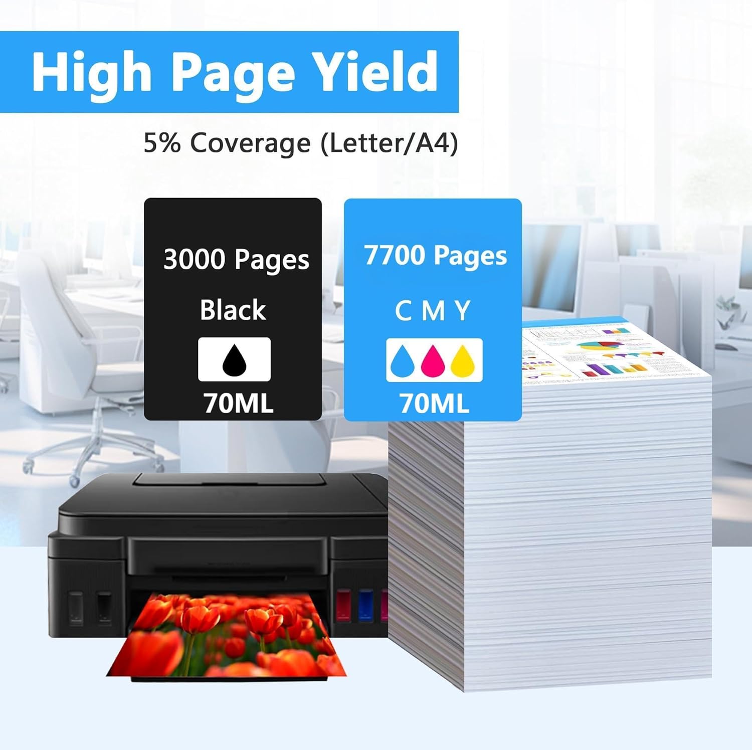 - High Capacity: Extra-large capacity ink bottle, longer replacement interval. Includes 4 Ink Bottles: Up to 3000 pages per GI25 black ink bottle in 70ml; 7700 pages per GI25 Cyan/Magenta/Yellow ink bottle in 70ml (with 5% Coverage of A4 paper).