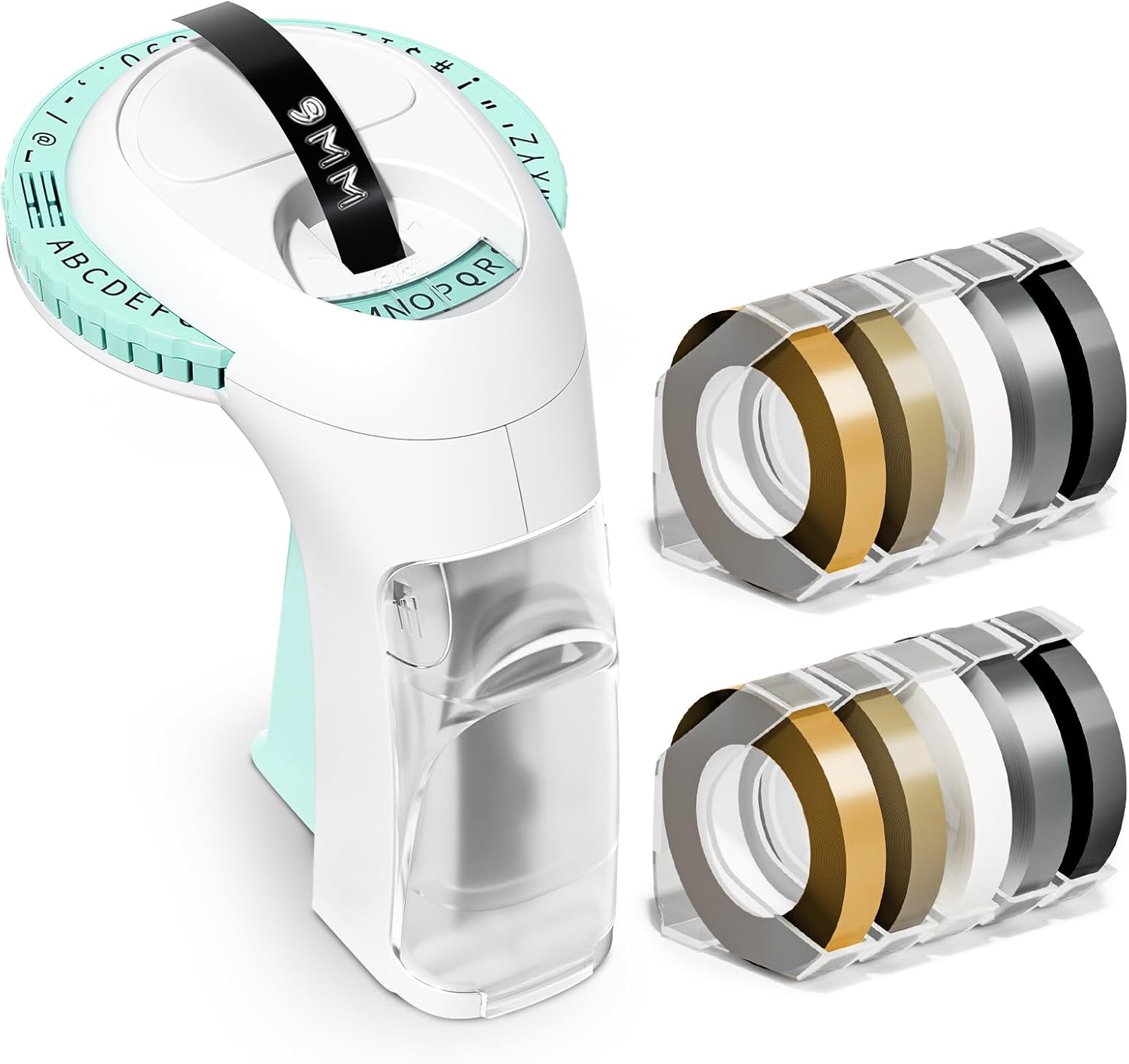 - Package Contents:It will come with a Green embossing label maker and 10 embossing label tapes (2 * champagne gold // 2 * gold / 2 * clear / 2 * silver / 2 * black embossing tape) for continuous use